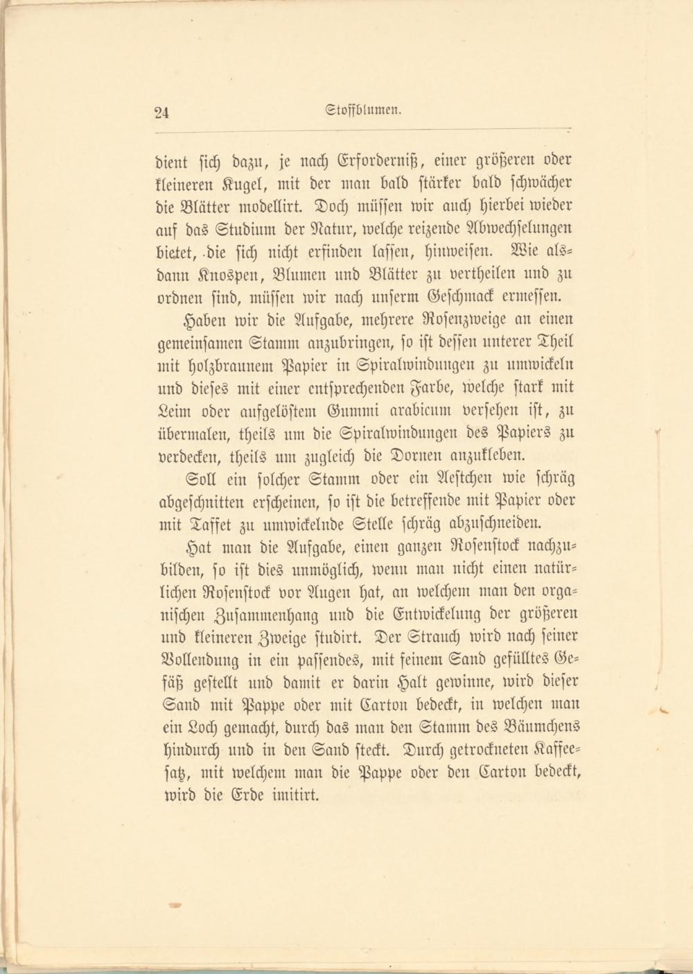 Hat man die Aufgabe, einen ganzen Rosenstock nachzubilden, so ist dies unmöglich, wenn man nicht einen natürlichen Rosenstock vor Augen hat, an welchem man den organischen Zusammenhang und die Entwickelung der größeren und kleineren Zweige studirt. Der Strauch wird nach seiner Vollendung in ein passendes, mit feinem Sand gefülltes Gefäß gestellt und damit er darin Halt gewinne, wird dieser Sand mit Pappe oder mit Carton bedeckt, in welchen man ein Loch gemacht, durch das man den Stamm des Bäumchens hindurch und in den Sand steckt. Durch getrockneten Kaffeesatz, mit welchem man die Pappe oder den Carton bedeckt, wird die Erde imitirt.