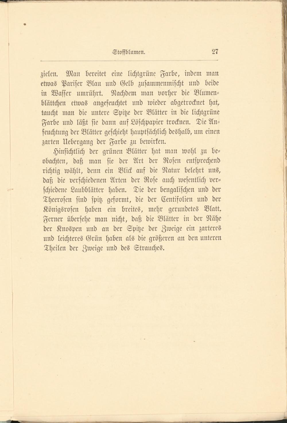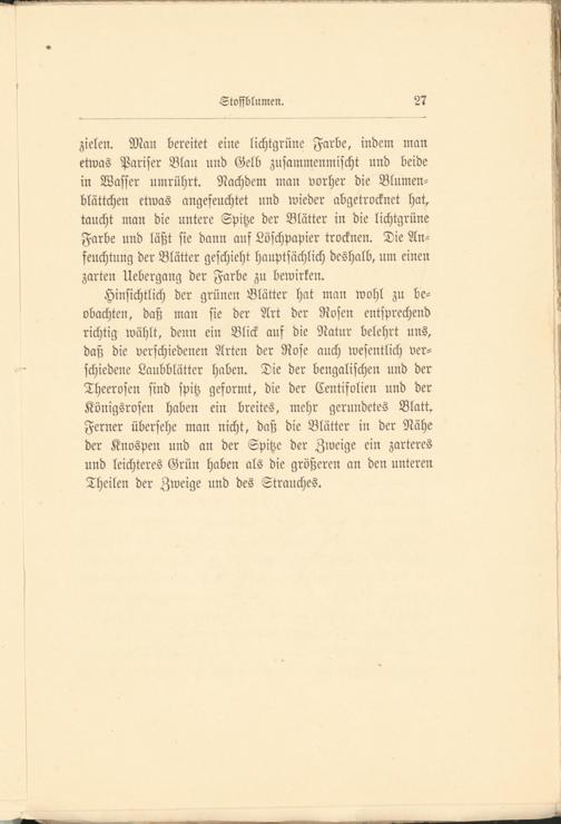 zielen. Man bereitet eine lichtgrüne Farbe, indem man etwas Pariser Man und Gelb zusammenmischt und beide in Wasser umrührt. Nachdem man vorher die Blumen- blättchen etwas angefeuchtet und wieder abgetrocknet hat, taucht man die untere Spitze der Blätter in die lichtgrüne Farbe und läßt sie dann auf Löschpapier trocknen. Die An- feuchtung der Blätter geschieht hauptsächlich deshalb, um einen zarten Uebergang der Farbe zu bewirken.