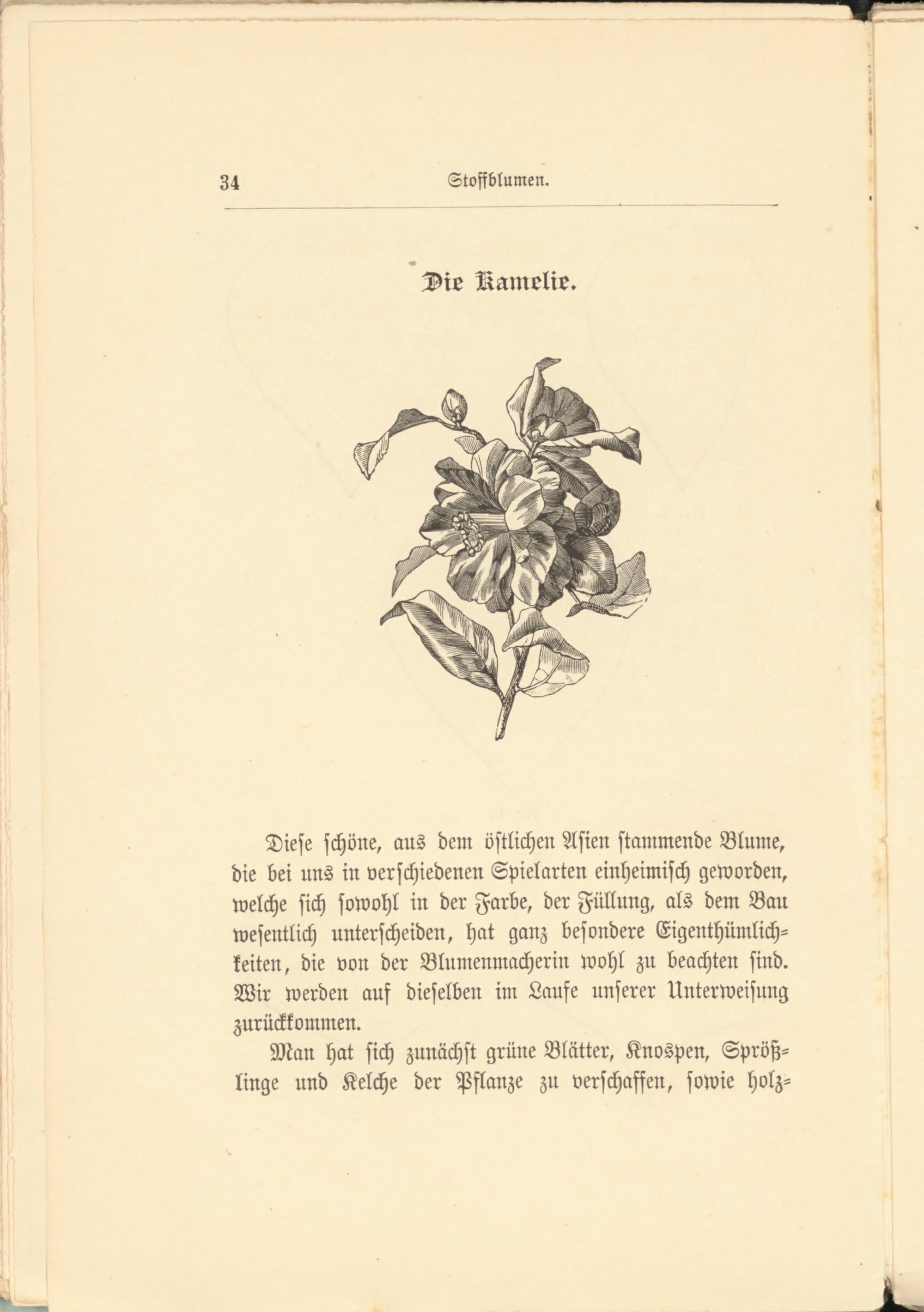 Diese schöne, aus dem östlichen Asien stammende Blume, die bei uns in verschiedenen Spielarten einheimisch geworden, welche sich sowohl in der Farbe, der Füllung, als dem Bau wesentlich unterscheiden, hat ganz besondere Eigenthümlichkeiten, die von der Blumenmacherin wohl zu beachten sind. Wir werden auf dieselben im Laufe unserer Unterweisung zurückkommen.