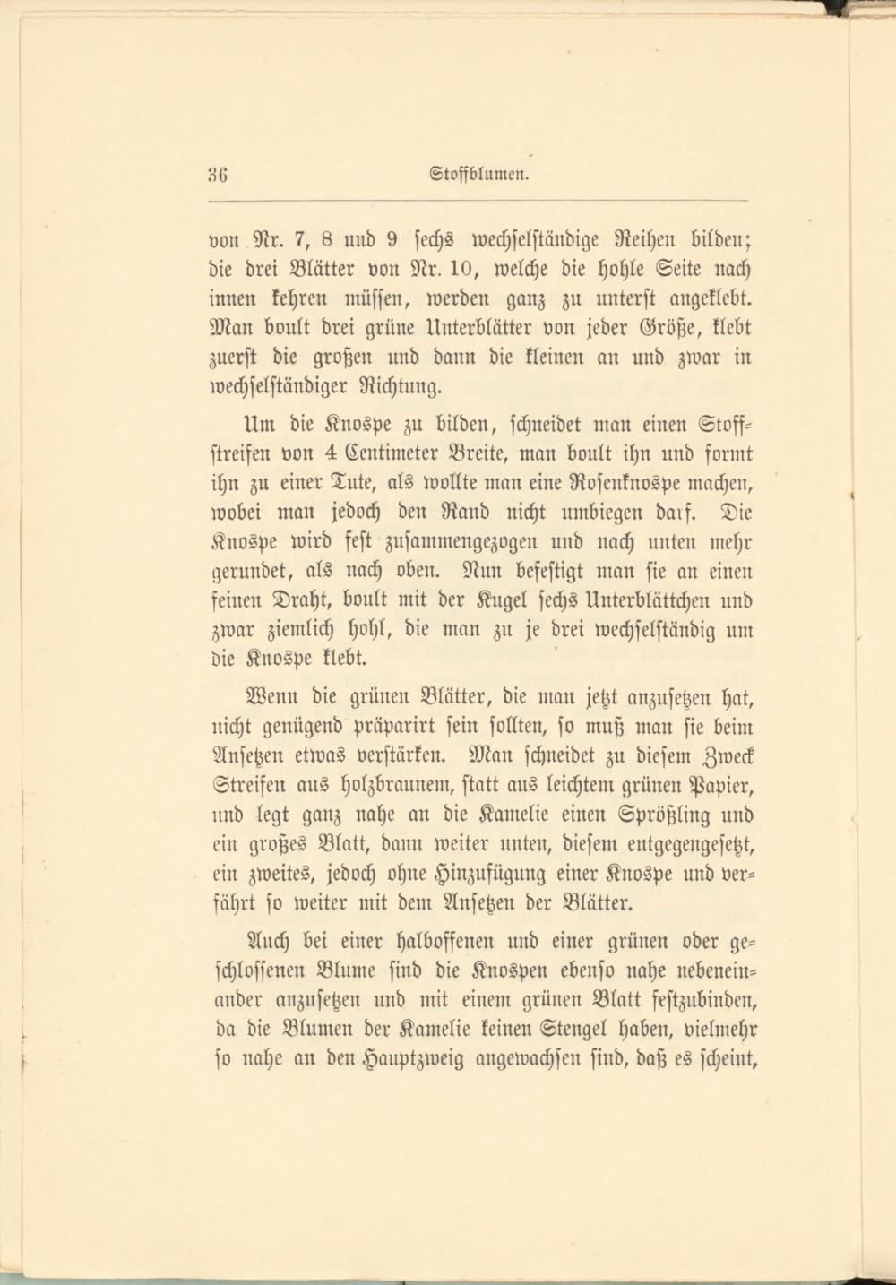 Um die Knospe zu bilden, schneidet man einen Stoffstreifen von 4 Centimeter Breite, man boult ihn und formt ihn zu einer Tute, als wollte man eine Rosenknospe machen, wobei man jedoch den Rand nicht umbiegen da»f. Die Knospe wird fest zusammengezogen und nach unten mehr gerundet, als nach oben. Nun befestigt man sie an einen feinen Draht, boult mit der Kugel sechs Unterblättchen und zwar ziemlich hohl, die man zu je drei wechselständig um die Knospe klebt.