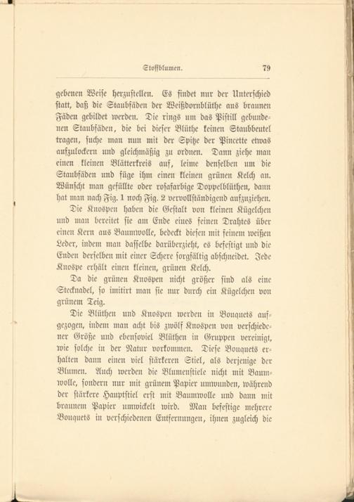 gebenen Weise herzustellen. Es findet nur der Unterschied statt, daß die Staubfäden der Weißdornblüthe aus braunen Fäden gebildet werden. Die rings um das Pistill gebundenen Staubfäden, die bei dieser Blüthe keinen Staubbeutel tragen, suche man nun mit der Spitze der Pincette etwas aufzulockern und gleichmäßig zu ordnen. Dann ziehe man einen kleinen Blätterkreis auf, leime denselben um die Staubfäden und füge ihn: einen kleinen grünen Kelch an. Wünscht man gefüllte oder rosafarbige Doppelblüthen, dann hat man nach Fig. 1 noch Fig. 2 vervollständigend aufzuziehen.