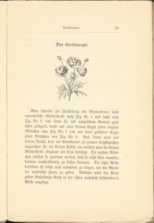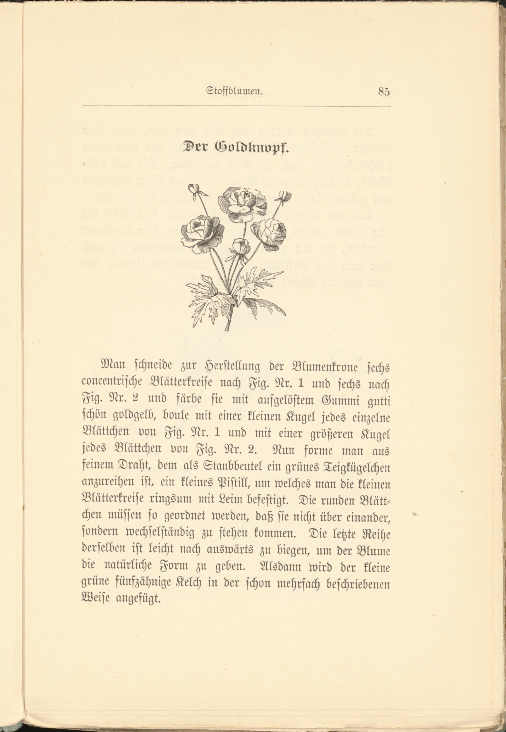 Man schneide zur Herstellung der Blumenkrone sechs concentrische Blätterkreise nach Fig. Nr. 1 und sechs nach Fig. Nr. 2 und färbe sie mit aufgelöstem Gummi gntti schön goldgelb, bonle mit einer kleinen Kugel jedes einzelne Blättchen von Fig. Nr. 1 und mit einer größeren Kugel jedes Blättchen von Fig. Nr. 2. Nun forme man aus feinem Draht, dem als Staubbeutel ein grünes Teigkügelchen anzureihen ist, ein kleines Pistill, um welches man die kleinen Blätterkreise ringsum mit Leim befestigt. Die runden Blättchen müssen so geordnet werden, daß sie nicht über einander, sondern wechselständig zu stehen kommen. Die letzte Reihe derselben ist leicht nach auswärts zu biegen, um der Blume die natürliche Form zu geben. Alsdann wird der kleine grüne fünszähnige Kelch in der schon mehrfach beschriebenen Weise angefügt.