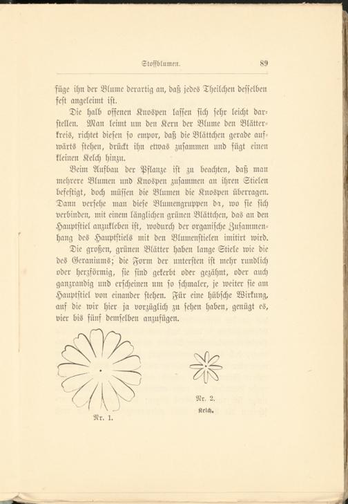 Beim Aufbau der Pflanze ist zu beachten, daß man mehrere Blumen und Knospen zusammen an ihren Stielen befestigt, doch müssen die Blumen die Knospen überragen. Dann versehe man diese Blumengruppen da, wo sie sich verbinden, mit einem länglichen grünen Blättchen, das an den Hanptstiel anzukleben ist, wodurch der organische Zusammenhang des Hauptstiels mit den Blumenstielen imitirt wird.