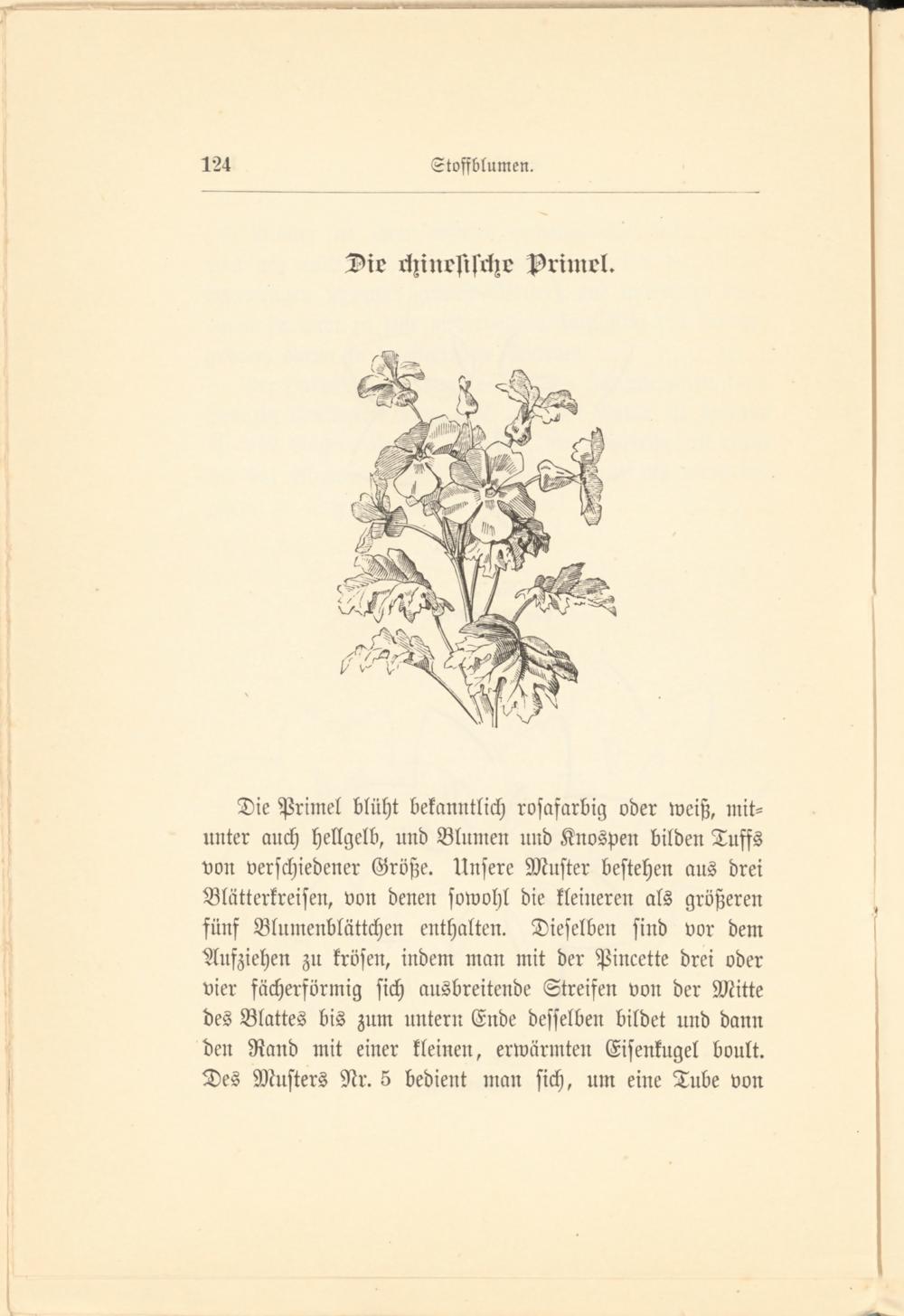 Die Primel blüht bekanntlich rosafarbig oder weiß, mitunter auch hellgelb, und Blumen und Knospen bilden Tuffs von verschiedener Größe. Unsere Muster bestehen aus drei Blätterkreisen, von denen sowohl die kleineren als größeren fünf Blnmenblättchen enthalten. Dieselben sind vor dem Aufziehen zu krösen, indem man mit der Pincette drei oder vier fächerförmig sich ausbreitende Streifen von der Mitte des Blattes bis zum untern Ende desselben bildet und dann den Rand mit einer kleinen, erwärmten Eisenkugel bonlt. Des Musters Nr. 5 bedient man sich, um eine Tube von