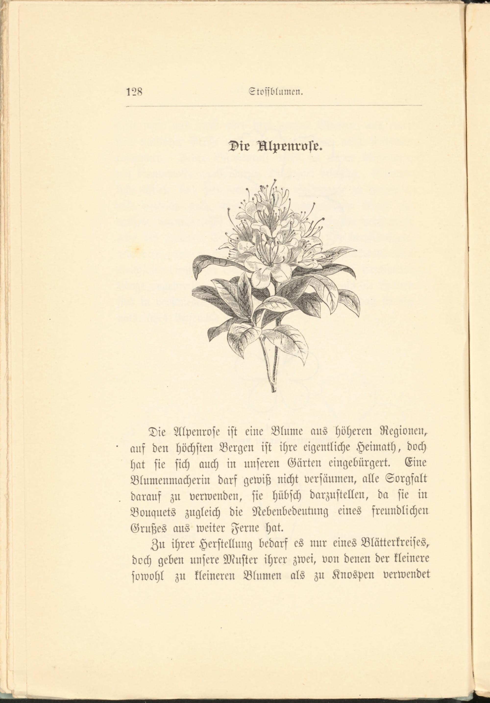 Die Alpenrose ist eine Blume aus höheren Regionen^ auf den höchsten Bergen ist ihre eigentliche Heimath, doch hat sie sich auch in unseren Gärten eingebürgert. Eine Blumenmacherin darf gewiß nicht versäumen, alle Sorgfalt darauf zu verwenden, sie hübsch darzustellen, da sie in Bouquets zugleich die Nebenbedeutung eines freundlichen Grußes aus weiter Ferne hat.
