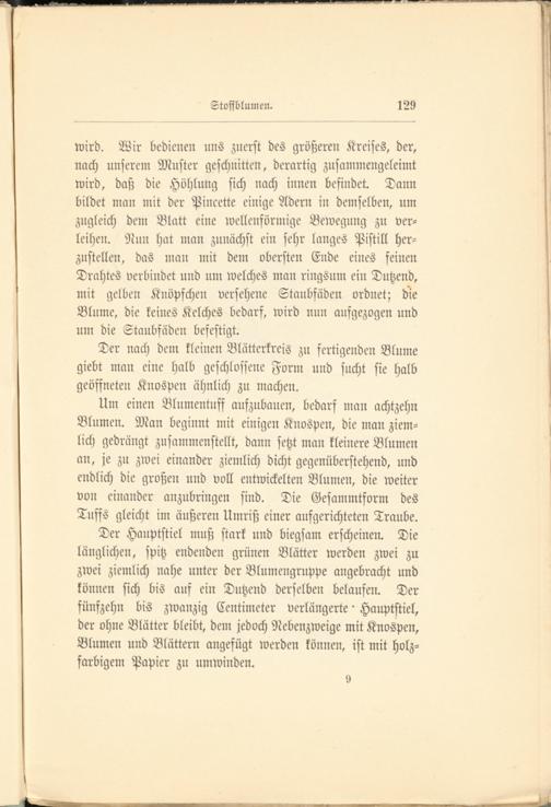 wird. Wir bedienen nns zuerst des größeren Kreises, der, nach unserem Muster geschnitten, derartig zusammengeleimt wird, daß die Höhlung sich nach innen befindet. Dann bildet man mit der Pincette einige Adern in demselben, um zugleich dem Blatt eine wellenförmige Bewegung zu verleihen. Nun hat man zunächst ein sehr langes Pistill herzustellen, das man mit dem obersten Ende eines feinen Drahtes verbindet und um welches man ringsum ein Dutzend, mit gelben Knöpfchen versehene Staubfäden ordnet; die Blume, die keines Kelches bedarf, wird nun aufgezogen und um die Staubfäden befestigt.