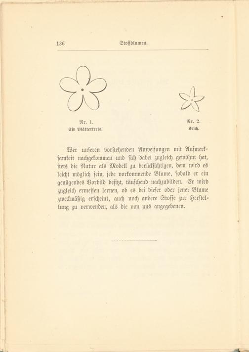 Wer unseren vorstehenden Anweisungen mit Aufmerksamkeit nachgekommen und sich dabei zugleich gewöhnt hat, stets die Natur als Modell zu berücksichtigen, dem wird es leicht möglich sein, jede vorkommende Blume, sobald er ein genügendes Vorbild besitzt, täuschend nachzubilden. Er wird zugleich ermessen lernen, ob es bei dieser oder jener Blume zweckmäßig erscheint, auch noch andere Stoffe zur Herstellung zu verwenden, als die von uns angegebenen.