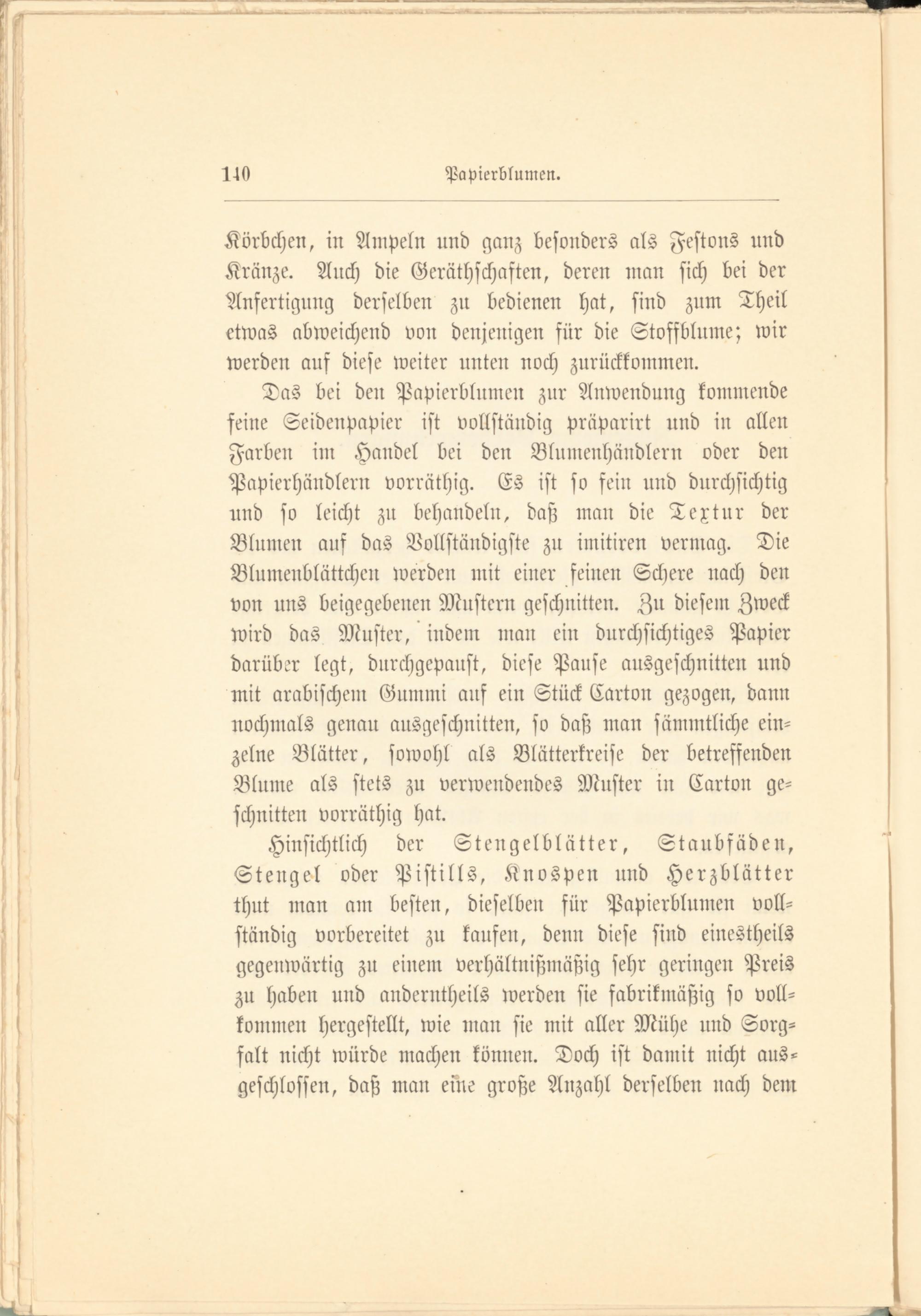 Hinsichtlich der Stengelblätter, Staubfäden, Stengel oder Pistills, Knospen und Herzblätter thut man am besten, dieselben für Papierblumen vollständig vorbereitet zu kaufen, denn diese sind einestheils gegenwärtig zu einem verhältnißmäßig sehr geringen Preis zu haben und anderntheils werden sie fabrikmäßig so vollkommen hergestellt, wie man sie mit aller Mühe und Sorgfalt nicht würde machen können. Doch ist damit nicht ausgeschlossen, daß man eine große Anzahl derselben nach dem