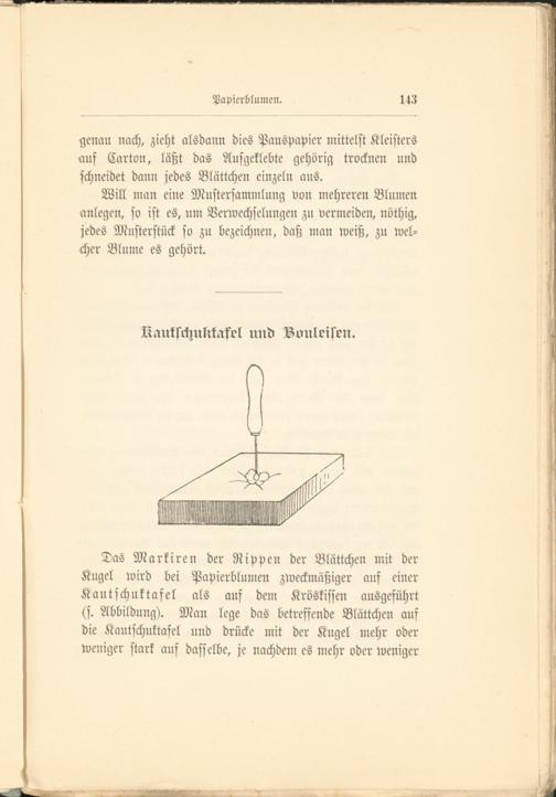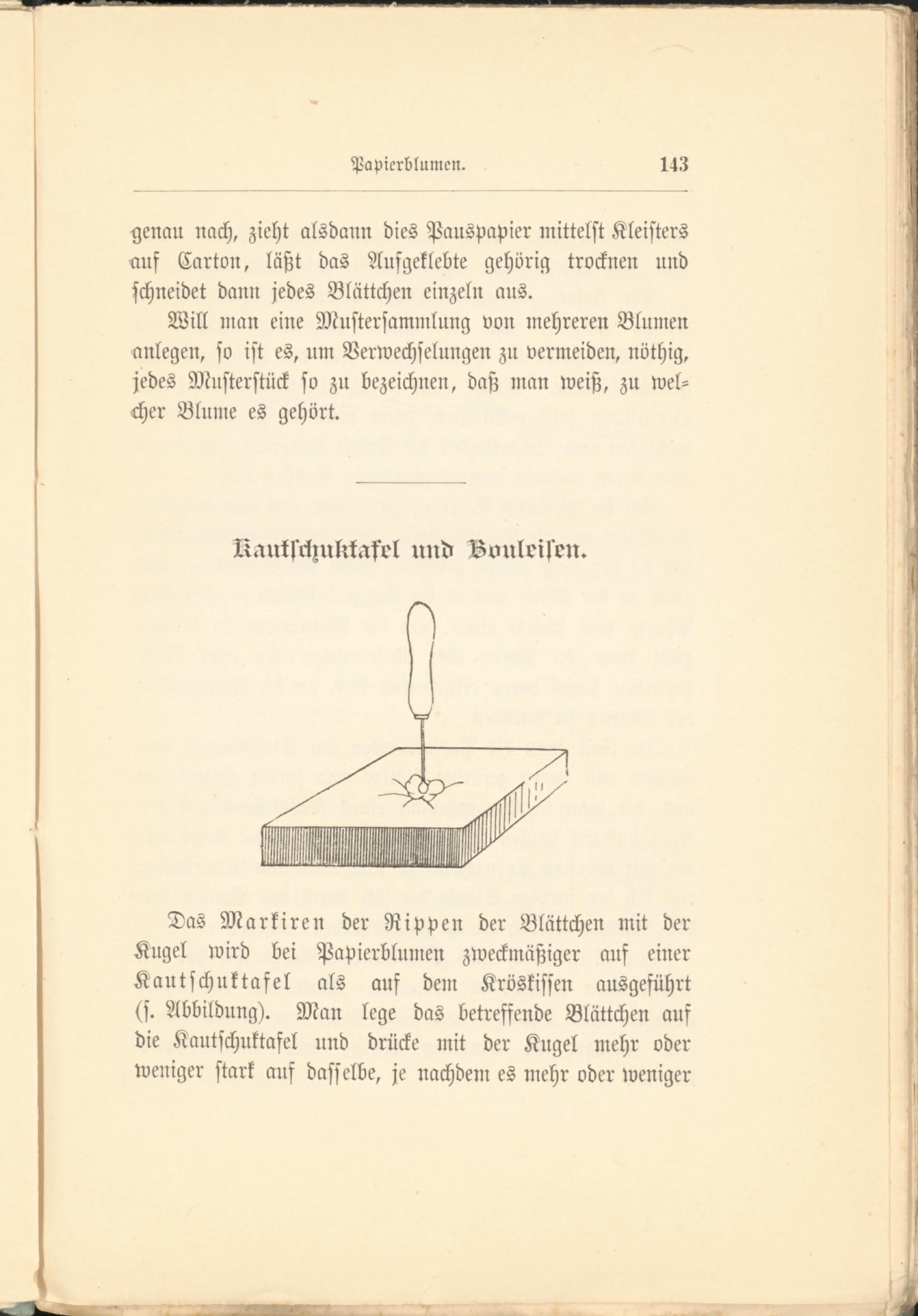 Das Markiren der Rippen der Blättchen mit der Kugel wird bei Papierblumen zweckmäßiger auf einer Kautschuktafel als auf dem Kröskissen ausgeführt (s. Abbildung). Man lege das betreffende Blättchen auf die Kautschuktafel und drücke mit der Kugel mehr oder weniger stark auf dasselbe, je nachdem es mehr oder weniger