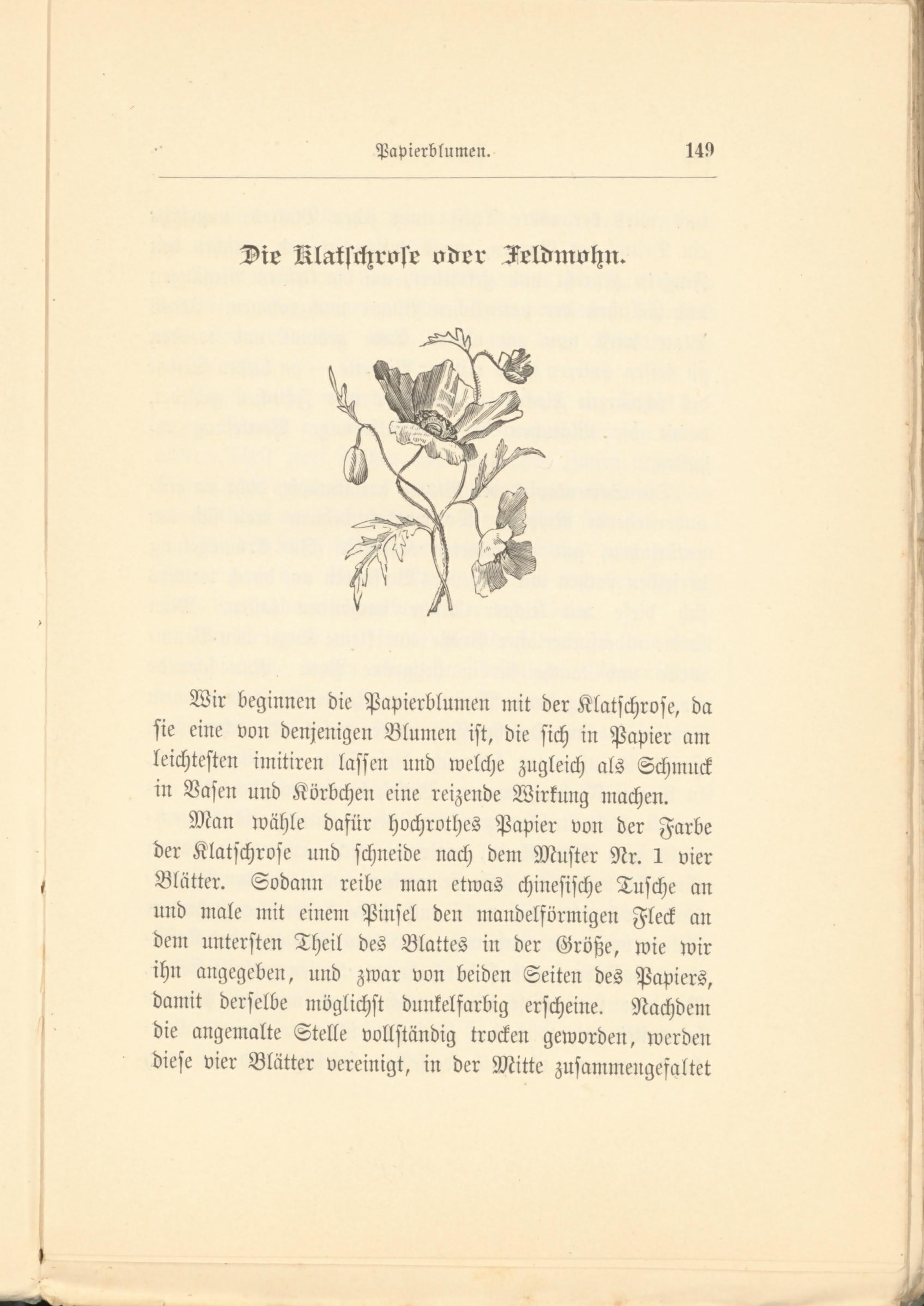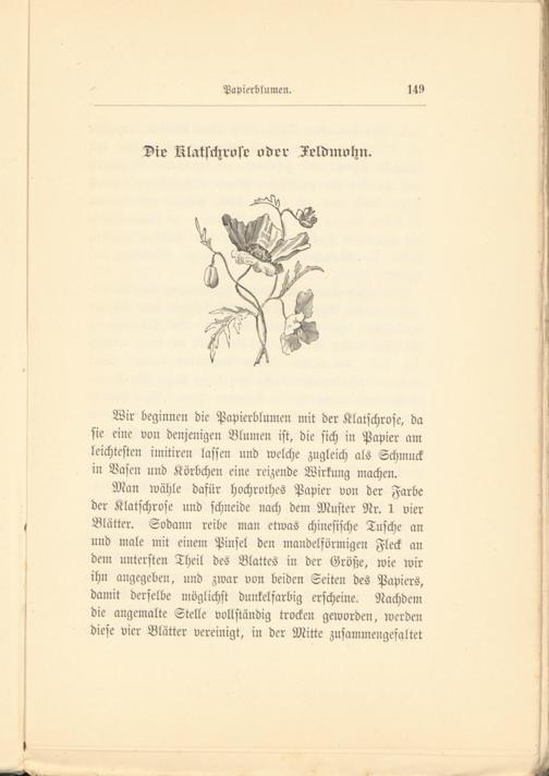 Wir beginnen die Papierblumen mit der Klatschrose, da sie eine von denjenigen Blumen ist, die sich in Papier am leichtesten imitiren lassen und welche zugleich als Schmuck in Vasen und Körbchen eine reizende Wirkung machen.