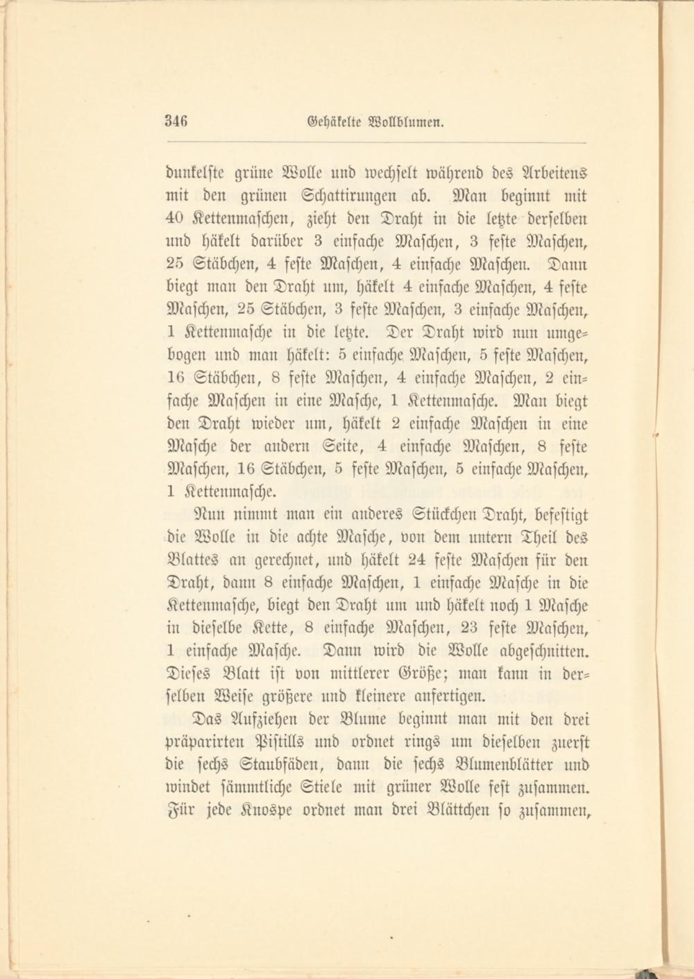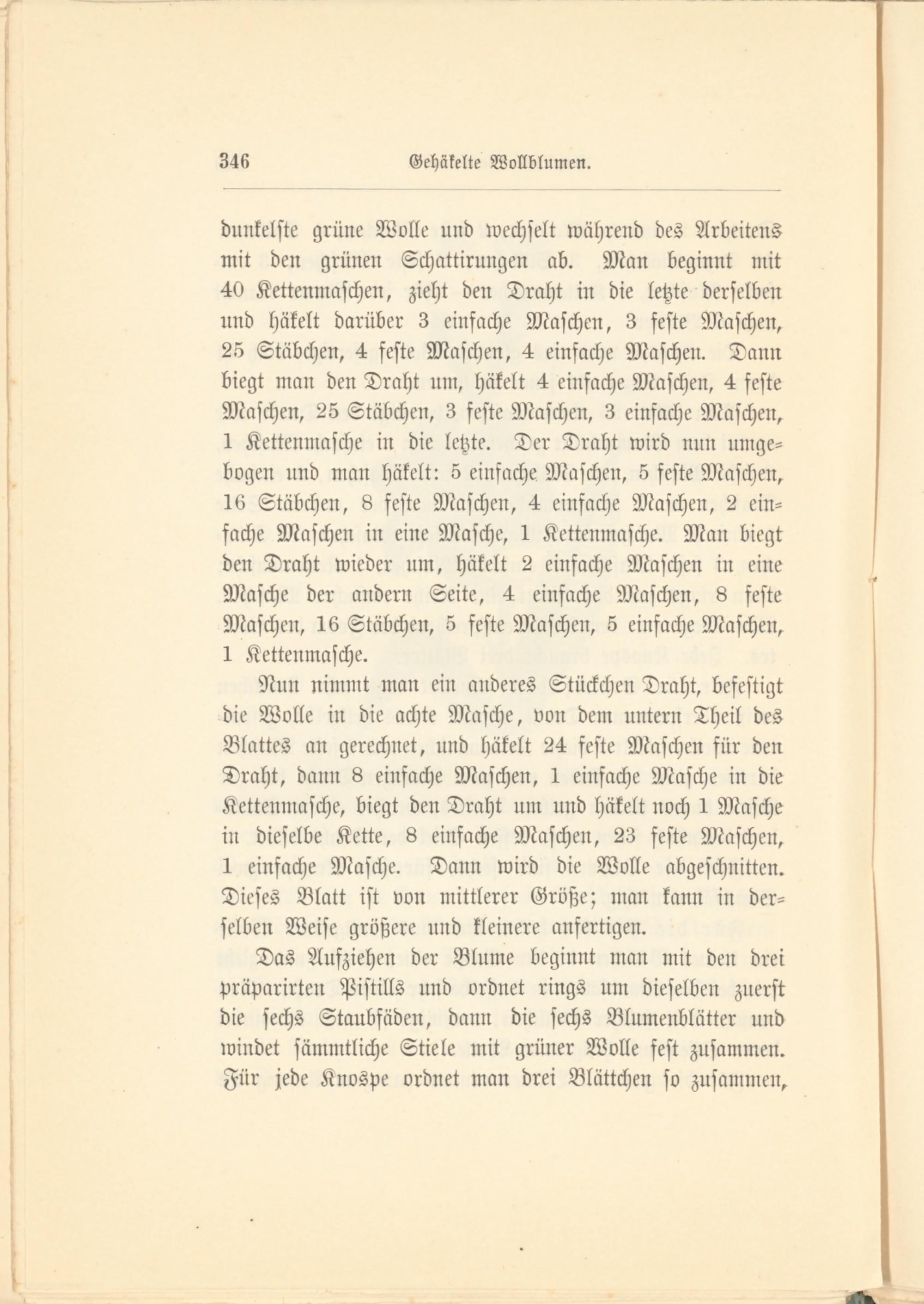 Nun nimmt man ein anderes Stückchen Draht, befestigt die Wolle in die achte Blasche, von dem untern Theil des Blattes an gerechnet, und häkelt 24 feste Maschen für den Draht, dann 8 einfache Maschen, 1 einfache Masche in die Kettenmasche, biegt den Draht um und häkelt noch 1 Masche in dieselbe Kette, 8 einfache Maschen, 23 feste Bläschen, 1 einfache Masche. Dann wird die Wolle abgeschnitten. Dieses Blatt ist von mittlerer Größe; man kann in derselben Weise größere und kleinere anfertigen.
