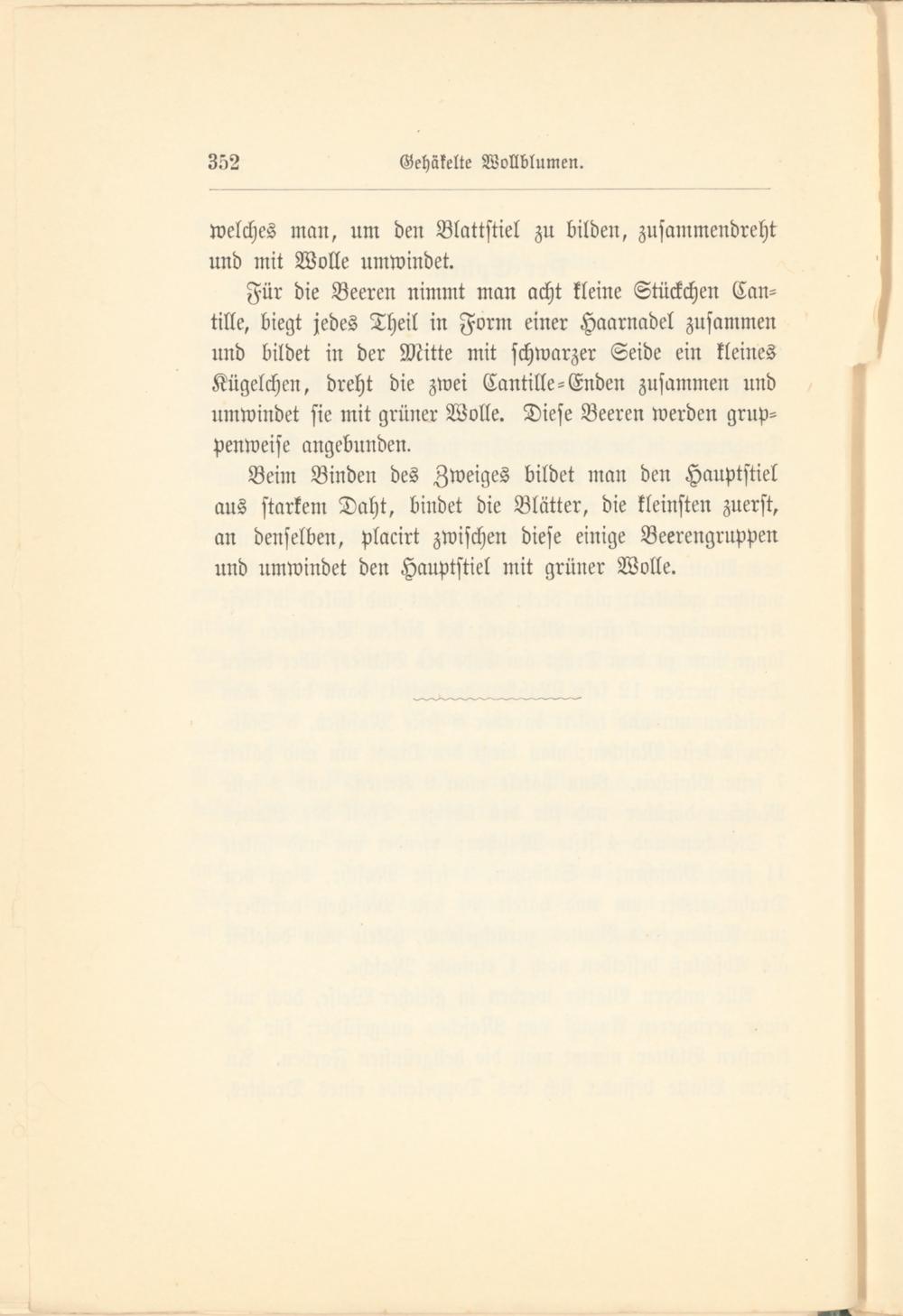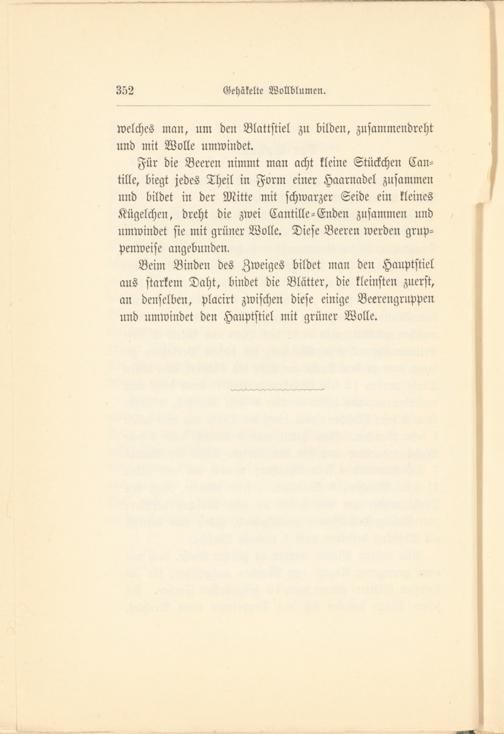 Für die Beeren nimmt man acht kleine Stückchen Can- tille, biegt jedes Theil in Form einer Haarnadel zusammen und bildet in der Mitte mit schwarzer Seide ein kleines Kügelchen, dreht die zwei Cantille-Enden zusammen und umwindet sie mit grüner Wolle. Diese Beeren werden gruppenweise angebunden.