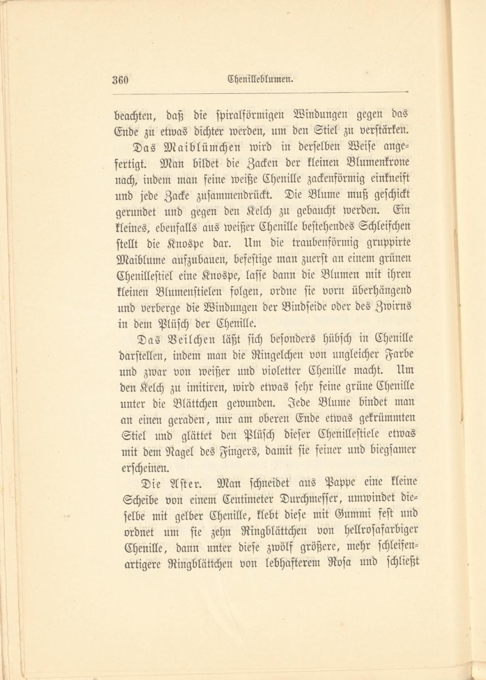 Das Maiblümchen wird in derselben Weise angefertigt. Man bildet die Zacken der kleinen Blumenkrone nach, indem man feine weiße Chenille zackenförmig einkneift und jede Zacke zusammendrückt. Die Blume muß geschickt gerundet und gegen den Kelch zu gebaucht werden. Ein kleines, ebenfalls aus weißer Chenille bestehendes Schleifchen stellt die Knospe dar. Um die tranbenförmig gruppirte Maiblume aufzubauen, befestige man zuerst an einem grünen Chenillestiel eine Knospe, lasse dann die Blumen mit ihren kleinen Blumenstielen folgen, ordne sie vorn überhängend und verberge die Windungen der Bindseide oder des Zwirns in dem Plüsch der Chenille.