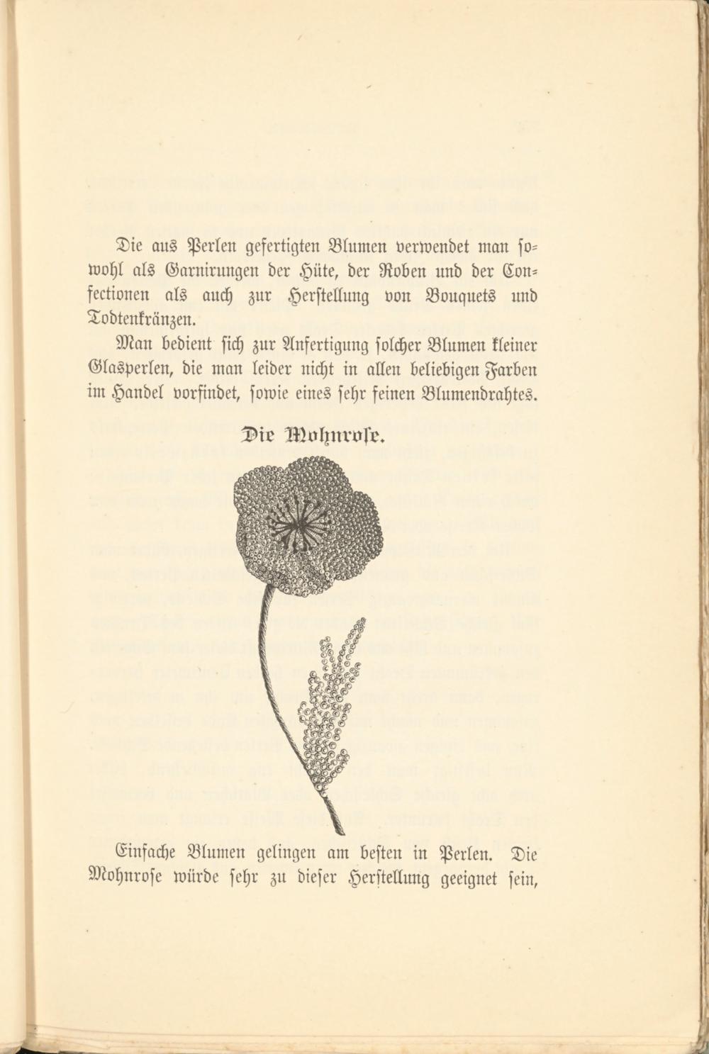 Die aus Perlen gefertigten Blumen verwendet man sowohl als Garnirungen der Hüte, der Roben und der Con- fectioneu als auch zur Herstellung von Bouquets und Todtenkränzen.