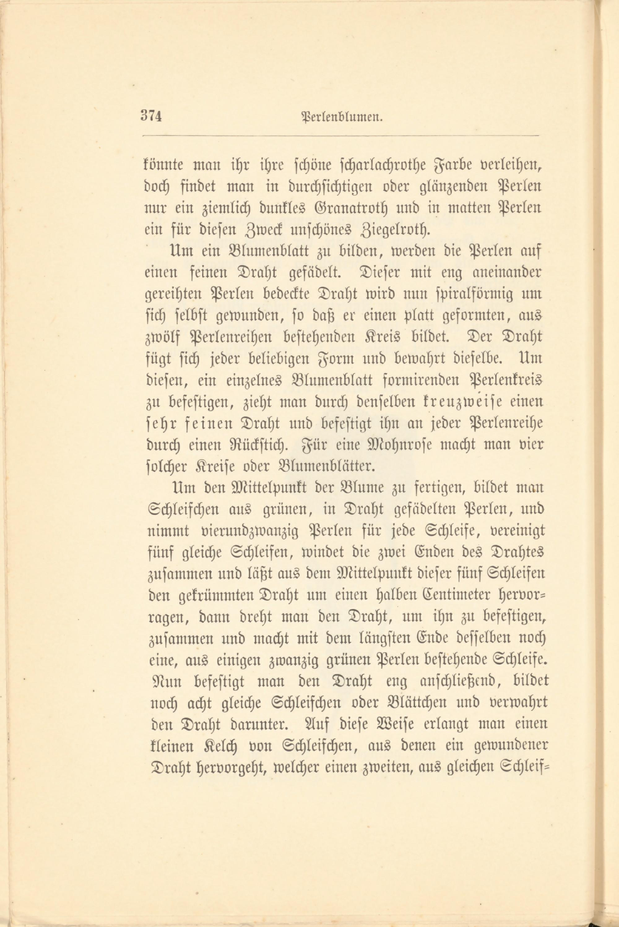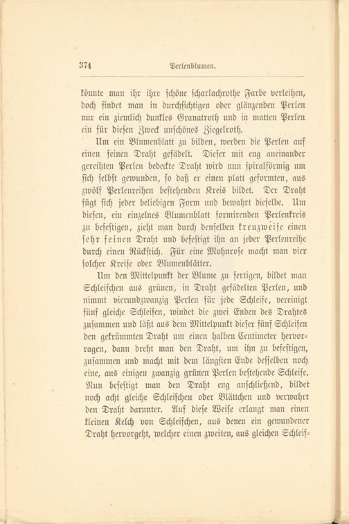 Um ein Blumenblatt zu bilden, werden die Perlen auf einen feinen Draht gefädelt. Dieser mit eng aneinander gereihten Perlen bedeckte Draht wird nun spiralförmig um sich selbst gewunden, so daß er einen platt geformten, aus zwölf Perlenreihen bestehenden Kreis bildet. Der Draht fügt sich jeder beliebigen Form und bewahrt dieselbe. Um diesen, ein einzelnes Blumenblatt formirenden Perlenkreis zu befestigen, zieht man durch denselben kreuzweise einen sehr feinen Draht und befestigt ihn an jeder Perlenreihe durch einen Rückstich. Für eine Mohnrose macht man vier solcher Kreise oder Blumenblätter.