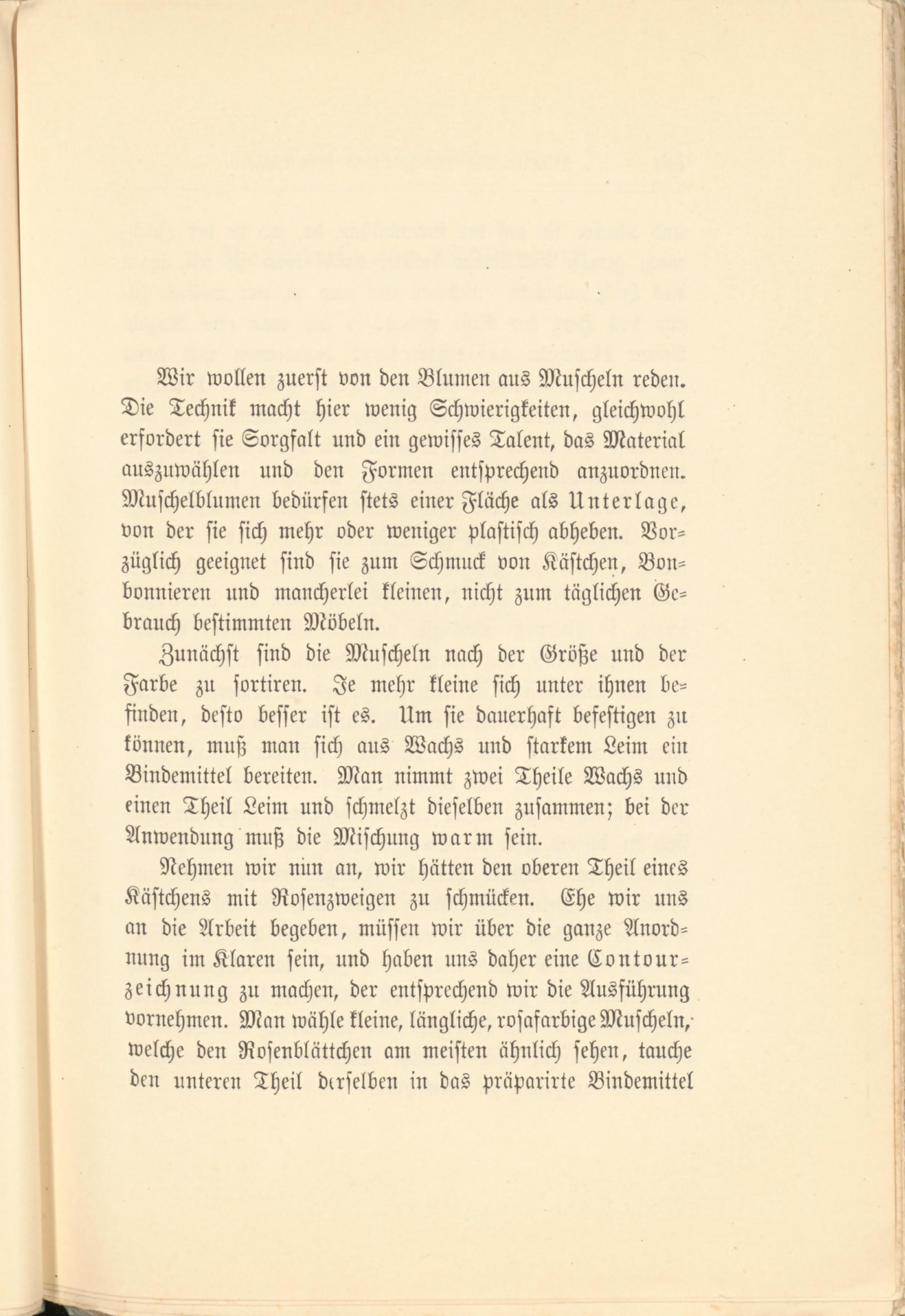 Nehmen wir nun an, wir hätten den oberen Theil eines Kästchens mit Rosenzweigen zu schmücken. Ehe wir uns an die Arbeit begeben, müssen wir über die ganze Anordnung im Klaren sein, und haben uns daher eine Contour- zeichnung zu machen, der entsprechend wir die Ausführung vornehmen. Man wähle kleine, längliche, rosafarbige Muscheln, welche den Rosenblättchen am meisten ähnlich sehen, tauche den unteren Theil derselben in das präparirte Bindemittel