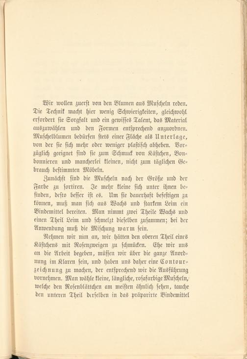 Wir wollen zuerst von den Blumen aus Muscheln reden. Die Technik macht hier wenig Schwierigkeiten, gleichwohl erfordert sie Sorgfalt und ein gewisses Talent, das Material auszuwählen und den Formen entsprechend anzuordnen. Muschelblumen bedürfen stets einer Fläche als Unterlage, von der sie sich mehr oder weniger plastisch abheben. Vorzüglich geeignet sind sie zum Schmuck von Kästchen, Bonbonnieren und mancherlei kleinen, nicht zum täglichen Gebrauch bestimmten Möbeln.