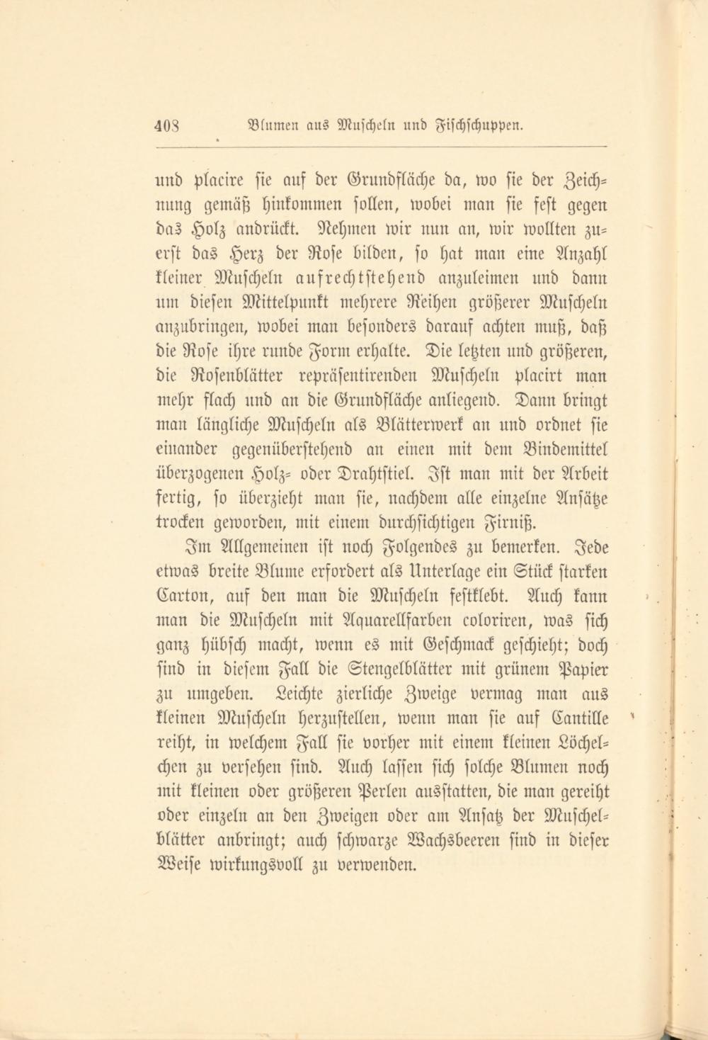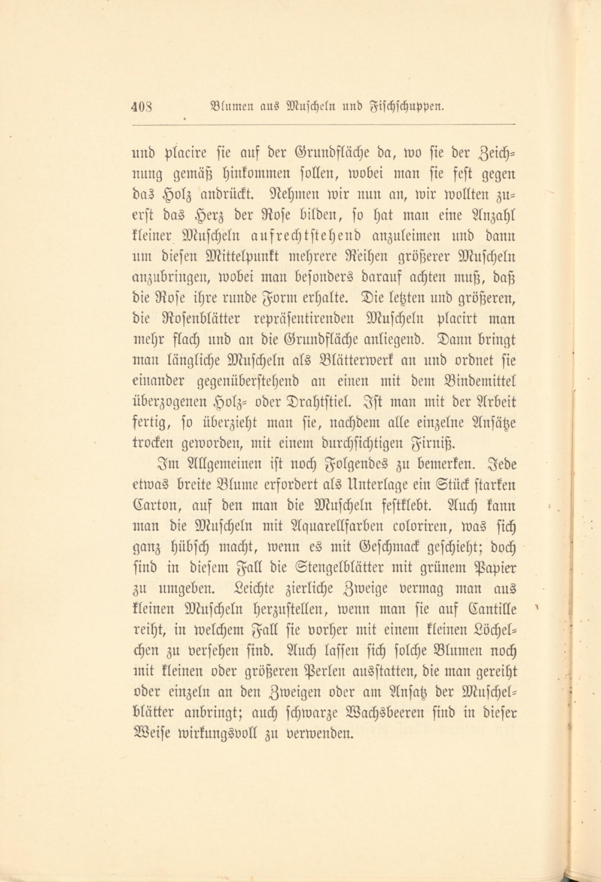 und placire sie auf der Grundfläche da, wo sie der Zeichnung gemäß hinkommen sollen, wobei man sie fest gegen das Holz andrückt. Nehmen wir nun an, wir wollten zuerst das Herz der Rose bilden, so hat man eine Anzahl kleiner Muscheln aufrechtstehend anzuleimen und dann um diesen Mittelpunkt mehrere Reihen größerer Muscheln anzubringen, wobei man besonders darauf achten muß, daß die Rose ihre runde Form erhalte. Die letzten und größeren, die Rosenblätter repräsentirenden Muscheln placirt man mehr flach und an die Grundfläche anliegend. Dann bringt man längliche Muscheln als Blätterwerk an und ordnet sie einander gegenüberstehend an einen mit dem Bindemittel überzogenen Holz- oder Drahtstiel. Ist man mit der Arbeit fertig, so überzieht man sie, nachdem alle einzelne Ansätze trocken geworden, mit einem durchsichtigen Firniß.