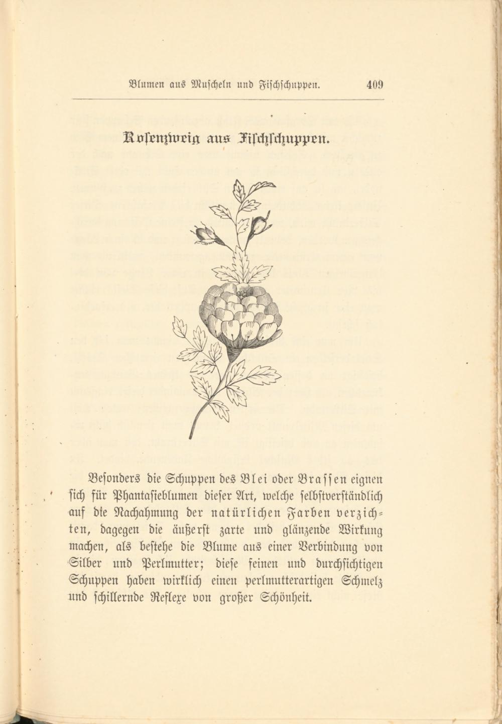 Besonders die Schuppen des Blei oder Brassen eignen ' sich für Phantasieblumen dieser Art, welche selbstverständlich auf die Nachahmung der natürlichen Farben verzichten, dagegen die äußerst zarte und glänzende Wirkung machen, als bestehe die Blume aus einer Verbindung von Silber und Perlmutter; diese feinen und durchsichtigen Schuppen haben wirklich einen perlmutterartigen Schmelz und schillernde Reflexe von großer Schönheit.