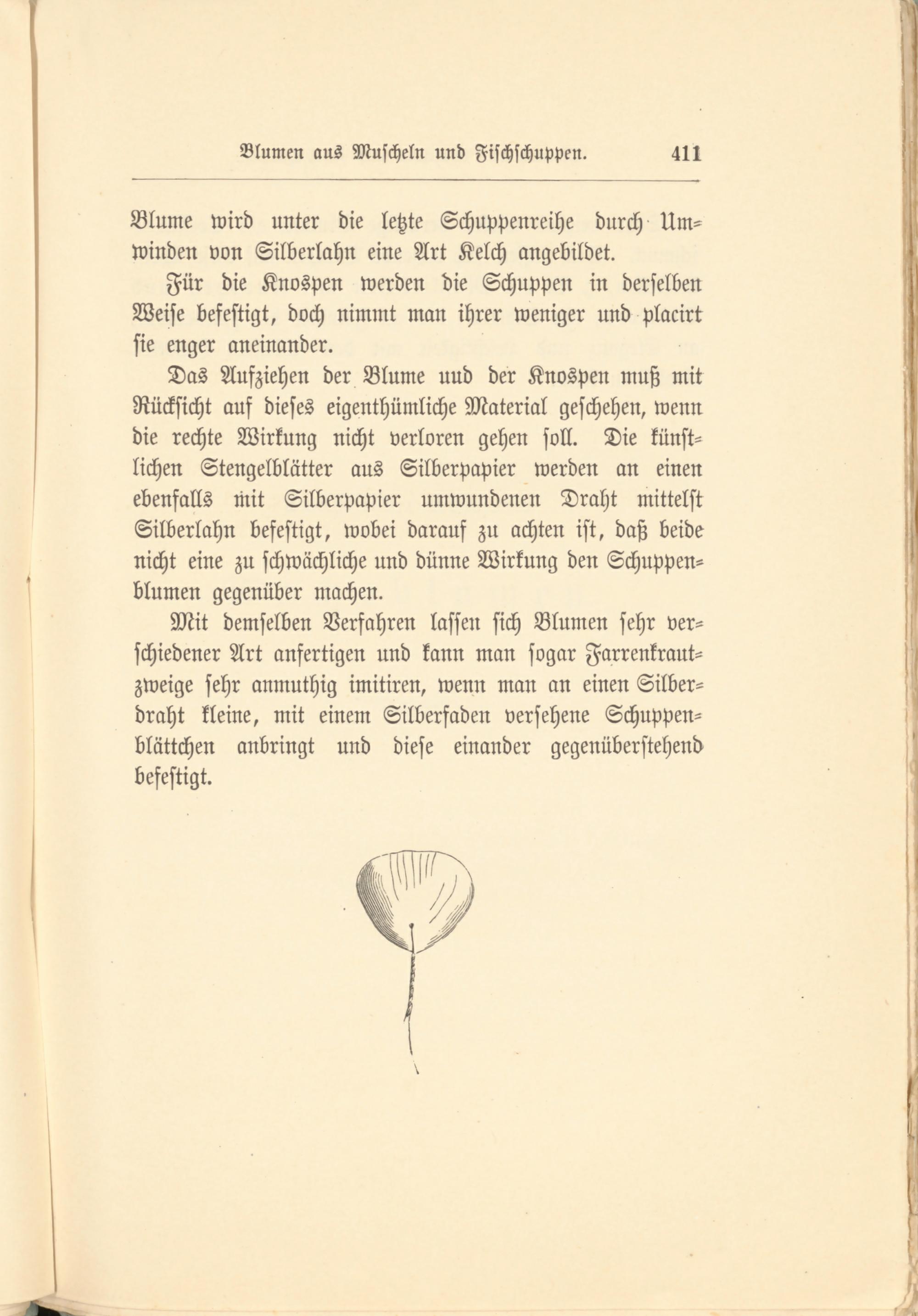 Mit demselben Verfahren lassen sich Blumen sehr verschiedener Art anfertigen und kann man sogar Farrenkraut- zweige sehr anmuthig imitiren, wenn man an einen Silberdraht kleine, mit einem Silberfaden versehene Schuppen- blättchen anbringt und diese einander gegenüberstehend befestigt.