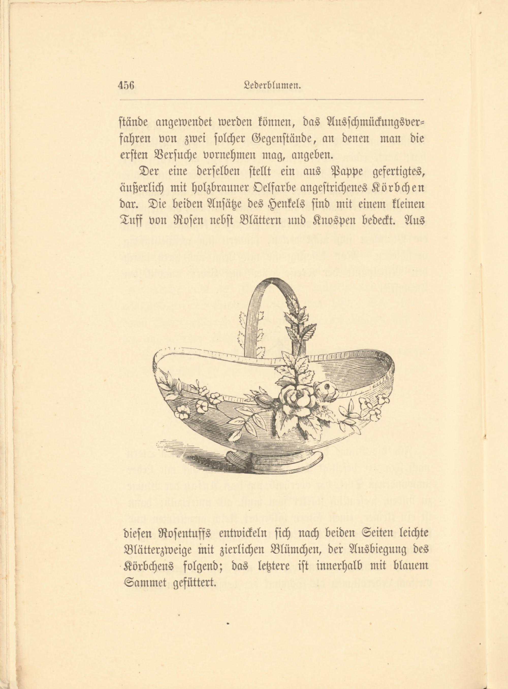 Der eine derselben stellt ein aus Pappe gefertigtes, äußerlich mit Holzbrauner Oelfarbe angestrichenes Körbchen dar. Die beiden Ansätze des Henkels sind mit einem kleinen Tuff von Rosen nebst Blättern und Knospen bedeckt. Aus