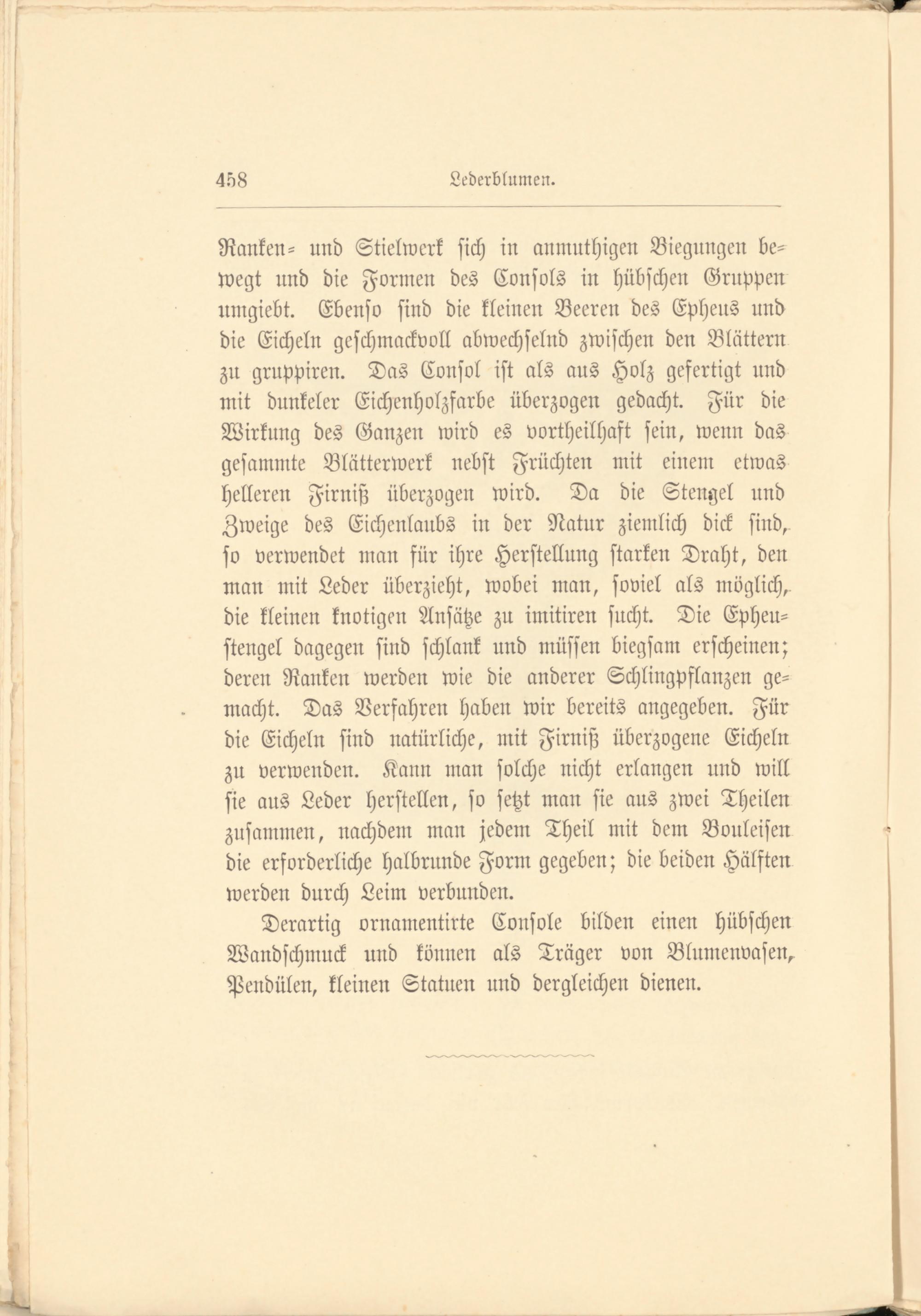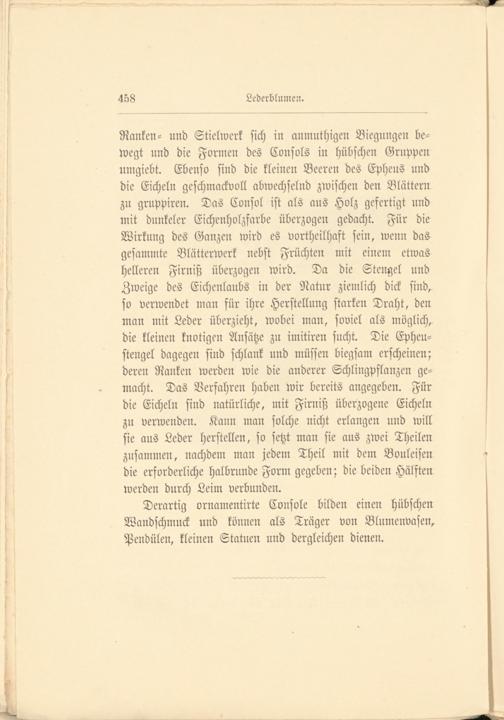 Ranken- und Stielwerk sich in anmuthigen Biegungen bewegt und die Formen des Consols in hübschen Gruppen umgiebt. Ebenso sind die kleinen Beeren des Ephens und die Eicheln geschmackvoll abwechselnd zwischen den Blättern zu gruppiren. Das Consol ist als aus Holz gefertigt und mit dunkeler Eichenholzfarbe überzogen gedacht. Für die Wirkung des Ganzen wird es Vortheilhaft sein, wenn das gesammte Blätterwerk nebst Früchten mit einem etwas helleren Firniß überzogen wird. Da die Stengel und Zweige des Eichenlaubs in der Natur ziemlich dick sind, so verwendet man für ihre Herstellung starken Draht, den man mit Leder überzieht, wobei man, soviel als möglich,, die kleinen knotigen Ansätze zu imitiren sucht. Die Epheu- stengel dagegen sind schlank und müssen biegsam erscheinen; deren Ranken werden wie die anderer Schlingpflanzen gemacht. Das Verfahren haben wir bereits angegeben. Für die Eicheln sind natürliche, mit Firniß überzogene Eicheln zu verwenden. Kann man solche nicht erlangen und will sie aus Leder herstellen, so setzt man sie aus zwei Theilen zusammen, nachdem man jedem Theil mit dem Bouleisen die erforderliche halbrunde Form gegeben; die beiden Hälften werden durch Leim verbunden.