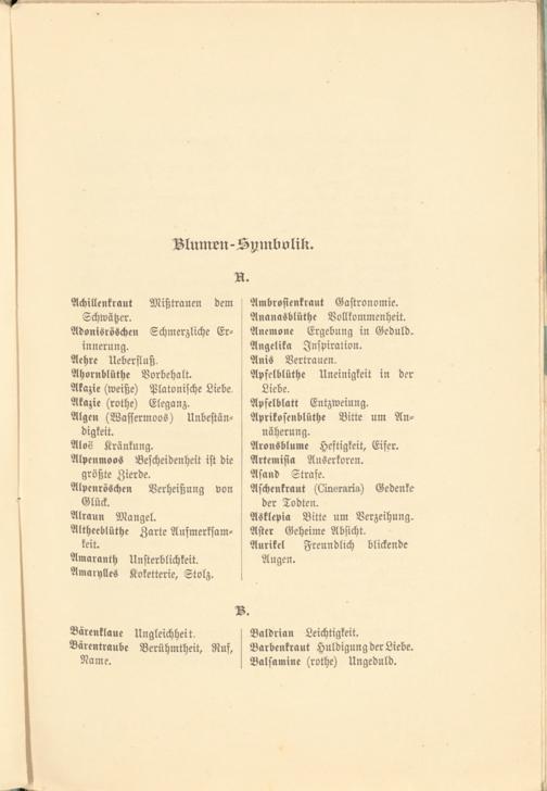 Baldrian Leichtigkeit. Barbenkraut Huldigung der Liebe. Balsamine (rothe) Ungeduld.