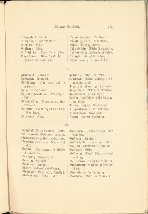 Fingerhut Frauengunst erwerbe. Fingerkraut Geliebtes Mädchen. Flachsblüthe Beständigkeit. Flieder (spanischer) Erste Regung der Liebe.