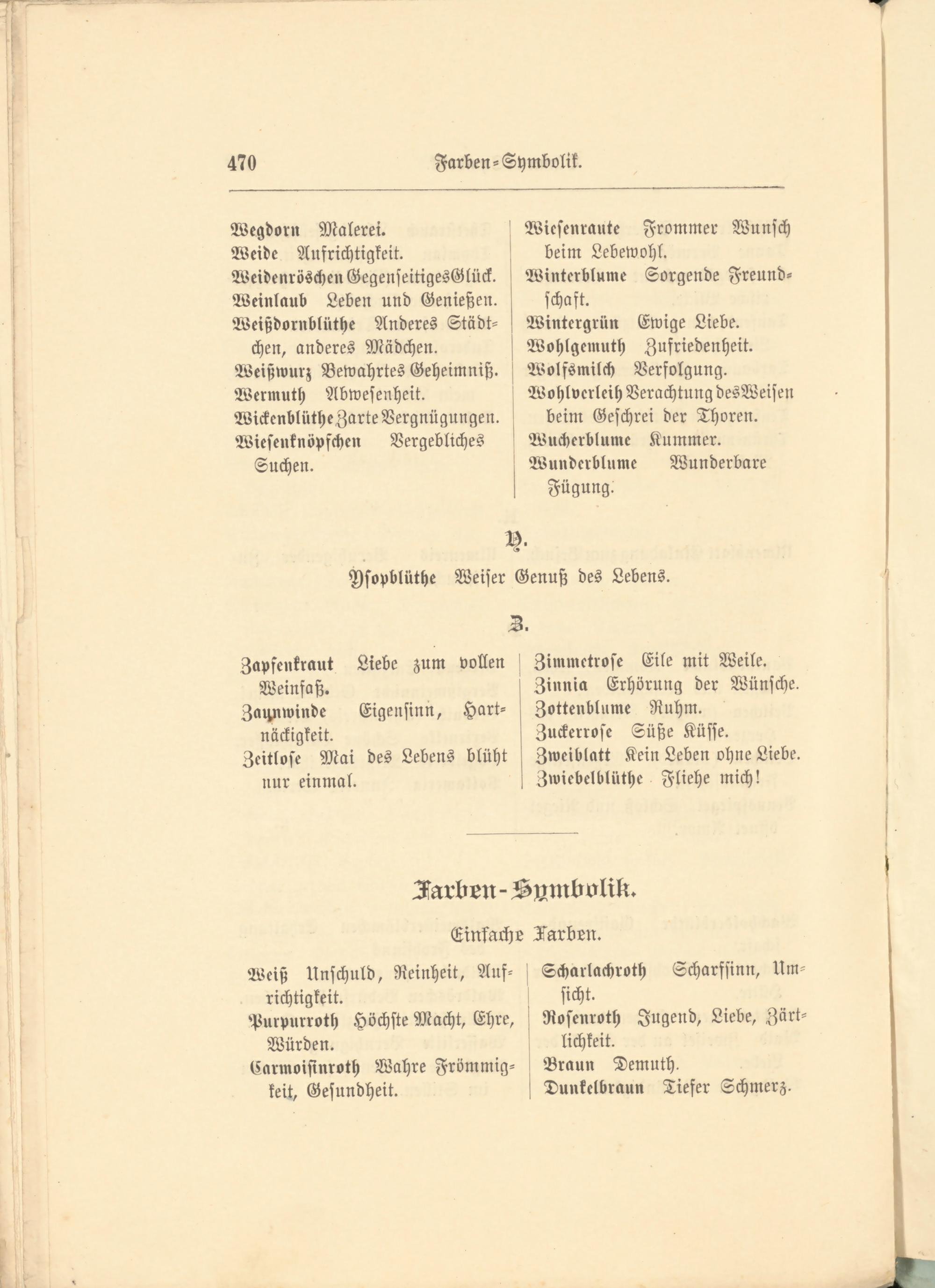 Weide Aufrichtigkeit. Weidenröschen GegenseitigesGlück. Weinlaub Leben und Genießen. Weißdornblüthe Anderes Städtchen, anderes Mädchen. Weißwurz Bewahrtes Geheimniß. Wermuth Abwesenheit. WickenblütheZarte Vergnügungen. Wieseuknöpfchen Vergebliches Suchen.