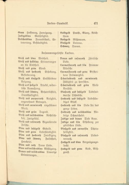 Grau Hoffnung, Zuneigung. Jndigoblau Gottseligkeit. Veilchenblau Freundschaft, Erinnerung, Beständigkeit.