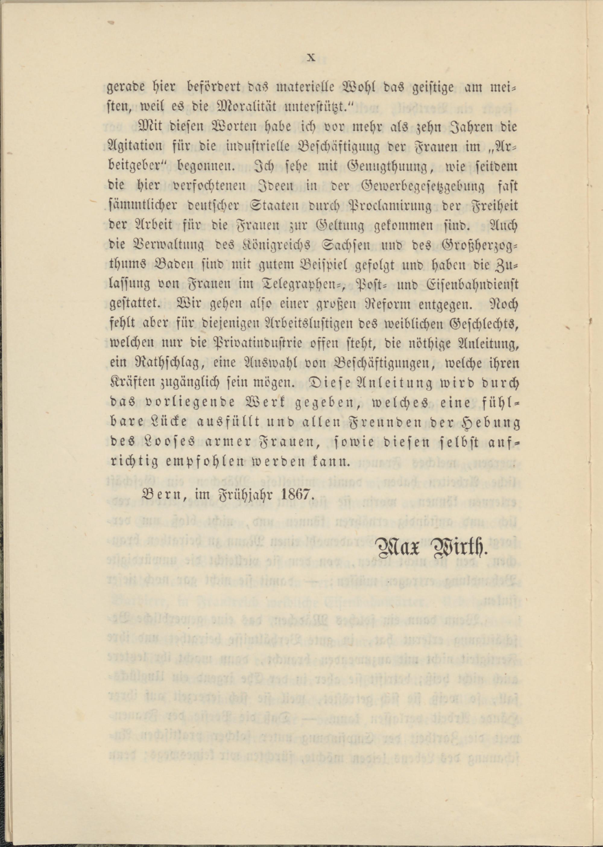 Mit diesen Worten habe ich vor mehr als zehn Jahren die Agitation für die industrielle Beschäftigung der Frauen im „Arbeitgeber" begonnen. Ich sehe mit Genugthuung, wie seitdem die hier oersochteuen Ideen in der Gewerbegesetzgebuug fast sämmtlicher deutscher Staaten durch Proclamirung der Freiheit der Arbeit für die Frauen zur Geltung gekommen sind. Auch die Verwaltung des Königreichs Sachsen und des Großherzog- thums Baden sind mit gutem Beispiel gefolgt und haben die Zulassung von Frauen im Telegraphen-, Post- und Eisenbahndieust gestattet. Wir gehen also einer großen Reform entgegen. Noch fehlt aber für diejenigen Arbeitslustigen des weiblichen Geschlechts, welchen nur die Privatiudnstrie offen steht, die nöthige Anleitung, ein Rathschlag, eine Auswahl von Beschäftigungen, welche ihren Kräften zugänglich sein mögen. Diese Anleitung wird durch das vorliegende Werk gegeben, welches eine fühlbare Lücke ausfüllt und allen Freunden der Hebung des Looses armer Frauen, sowie diesen selbst aufrichtig empfohlen werden kann.