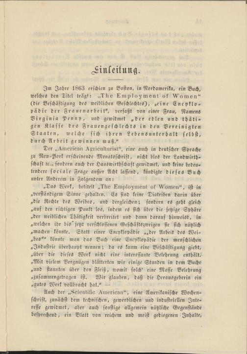 Im Jahre 1863 erschien zu Baston, in Nordamerika, ein Buch, welches den Titel trägt: „T 6 6 Lmplo^mcnt ok ^omen" (die Beschäftigung des weiblichen Geschlechtes), „eine Encyklopädie der Frauenarbeit", verfaßt von einer Frau, Namens Virginia Penny, und gewidmet „der edlen und thätigen Klasse des Frauengeschlcchts in den Vereinigten Staaten, welche sich ihren Lebensunterhalt selbst, durch Arbeit gewinnen muß."