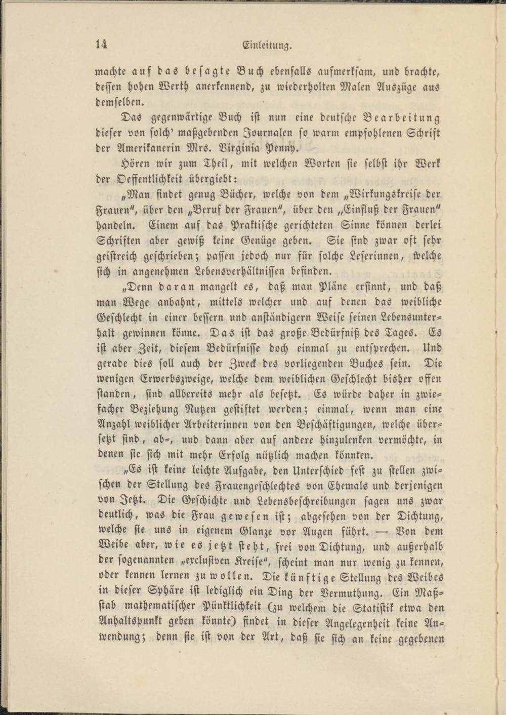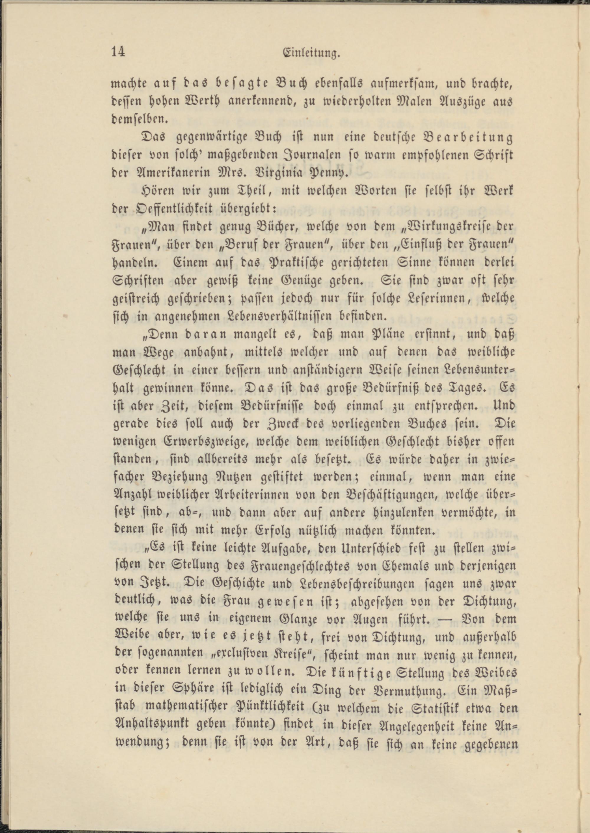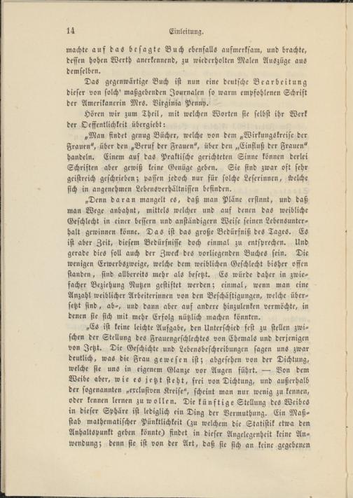 „Denn daran mangelt es, daß man Pläne ersinnt, und daß man Wege anbahnt, mittels welcher und auf denen das weibliche Geschlecht in einer bessern und anständigern Weise seinen Lebensunterhalt gewinnen könne. Das ist das große Bedürfniß des Tages. Es ist aber Zeit, diesem Bedürfnisse doch einmal zu entsprechen. Und gerade dies soll auch der Zweck des vorliegenden Buches sein. Die wenigen Erwerbszweige, welche dem weiblichen Geschlecht bisher offen standen, sind allbereits mehr als besetzt. Es würde daher in zwiefacher Beziehung Nutzen gestiftet werden; einmal, wenn man eine Anzahl weiblicher Arbeiterinnen von den Beschäftigungen, welche übersetzt sind, ab-, und dann aber auf andere hinzulenken vermöchte, in denen sie sich mit mehr Erfolg nützlich machen könnten.