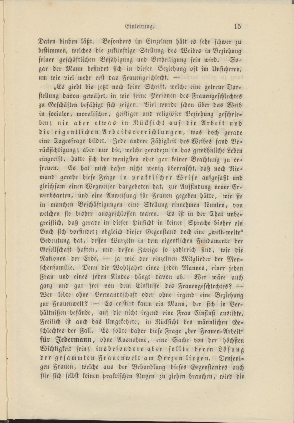 „Es giebt bis jetzt noch keine Schrift, welche eine getreue Darstellung davon gewährt, in wie ferne Personen des Frauengeschlechtes zu Geschäften befähigt sich zeigen. Viel wurde schon über das Weib in socialer, moralischer, geistiger und religiöser Beziehung geschrieben; nie aber etwas in Rücksicht auf die Arbeit und die eigentlichen ArbeitS Verrichtungen, was doch gerade eine Tagesfrage bildet. Jede andere Fähigkeit des Weibes fand Berücksichtigung; aber nur die, welche geradezu in das gewöhnliche Leben eingreift, hatte sich der wenigsten oder gar keiner Beachtung zu erfreuen. Es hat mich daher nicht wenig überrascht, daß noch Niemand gerade diese Frage in praktischer Weise aufgefaßt und gleichsam einen Wegweiser dargeboten hat, zur Auffindung neuer Erwerbsarten, und eine Anweisung für Frauen gegeben hätte, wie sie in manchen Beschäftigungen eine Stellung einnehmen könnten, von welchen sie bisher ausgeschlossen waren. Es ist in der That unbegreiflich, daß gerade in dieser Hinsicht in keiner Sprache bisher ein Buch sich vorfindet; obgleich dieser Gegenstand doch eine „welt-weite" Bedeutung hat, dessen Wurzeln in dem eigentlichen Fundamente der Gesellschaft haften, und dessen Zweige so zahlreich sind, wie die Nationen der Erde, — ja wie der einzelnen Mitglieder der Men- schcnfamilie. Denn die Wohlfahrt eines jeden Mannes, einer jeden Frau und eines jeden Kindes hangt davon ab. Wer wäre auch ganz und gar frei von dem Einflüsse des Frauengeschlechtes? — Wer lebte ohne Verwandtschaft oder ohne irgend eine Beziehung zur Frauenwelt? — Es cxistirt kaum ein Mann, der sich in Verhältnissen befände, auf die nicht irgend eine Frau Einfluß ausübte. Freilich ist auch das Umgekehrte, in Rücksicht des männlichen Geschlechtes der Fall. Es sollte daher diese Frage „der Frauen-Arbeit" für Jedermann, ohne Ausnahme, eine Sache von der höchsten Wichtigkeit sein; insbesondere aber sollte deren Lösung der gesammten Frauenwelt am Herzen liegen. Denjenigen Frauen, welche aus der Behandlung dieses Gegenstandes auch für sich selbst keinen praktischen Nutzen zu ziehen brauchen, wird die