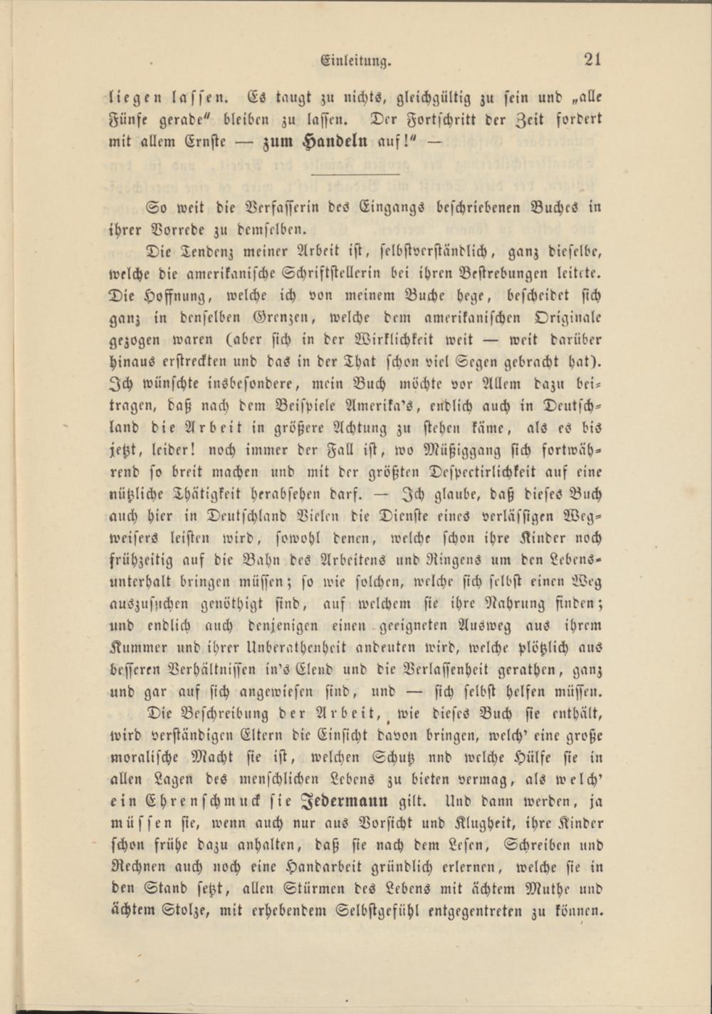 Die Beschreibung der Arbeit, wie dieses Buch sie enthält, wird verständigen Eltern die Einsicht davon bringen, welch' eine große moralische Macht sie ist, welchen Schutz nnd welche Hülfe sie in allen Lagen des menschlichen Lebens zu bieten vermag, als welch' ein Ehren schmuck sie Jedermann gilt. Und dann werden, ja müssen sie, wenn auch nur aus Vorsicht und Klugheit, ihre Kinder ' schon frühe dazu anhalten, daß sie nach dem Lesen, Schreiben und Rechnen auch noch eine Handarbeit gründlich erlernen, welche sie in den Stand setzt, allen Stürmen des Lebens mit ächtem Muthe und ächtem Stolze, mit erhebendem Selbstgefühl entgegentreten zu können.