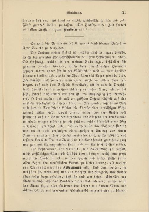 Die Tendenz meiner Arbeit ist, selbstverständlich, ganz dieselbe, welche die amerikanische Schriftstellerin bei ihren Bestrebungen leitete. Die Hoffnung, welche ich von meinem Buche hege, beschcidet sich ganz in denselben Grenzen, welche dem amerikanischen Originale gezogen waren (aber sich in der Wirklichkeit weit — weit darüber hinaus erstreckten und das in der That schon viel Segen gebracht hat). Ich wünschte insbesondere, mein Buch möchte vor Allem dazu beitragen, daß nach dem Beispiele Amerika's, endlich auch in Deutschland die Arbeit in größere Achtung zu stehen käme, als eS bis jetzt, leider! noch immer der Fall ist, wo Müßiggang sich fortwährend so breit machen und mit der größten Despectirlichkeit auf eine nützliche Thätigkeit herabsehen darf. — Ich glaube, daß dieses Buch auch hier in Deutschland Vielen die Dienste eines verlässigen Wegweisers leisten wird, sowohl denen, welche schon ihre Kinder noch frühzeitig auf die Bahn des Arbeitens und Ringens um den Lebensunterhalt bringen müssen; so wie solchen, welche sich selbst einen Weg auszusuchen genöthigt sind, aus welchem sie ihre Nahrung finden; und endlich auch denjenigen einen geeigneten Ausweg aus ihrem Kummer und ihrer Unberathenheit andeuten wird, welche plötzlich aus besseren Verhältnissen in's Elend und die Verlassenheit gerathen, ganz und gar auf sich angewiesen sind, und — sich selbst helfen müssen.