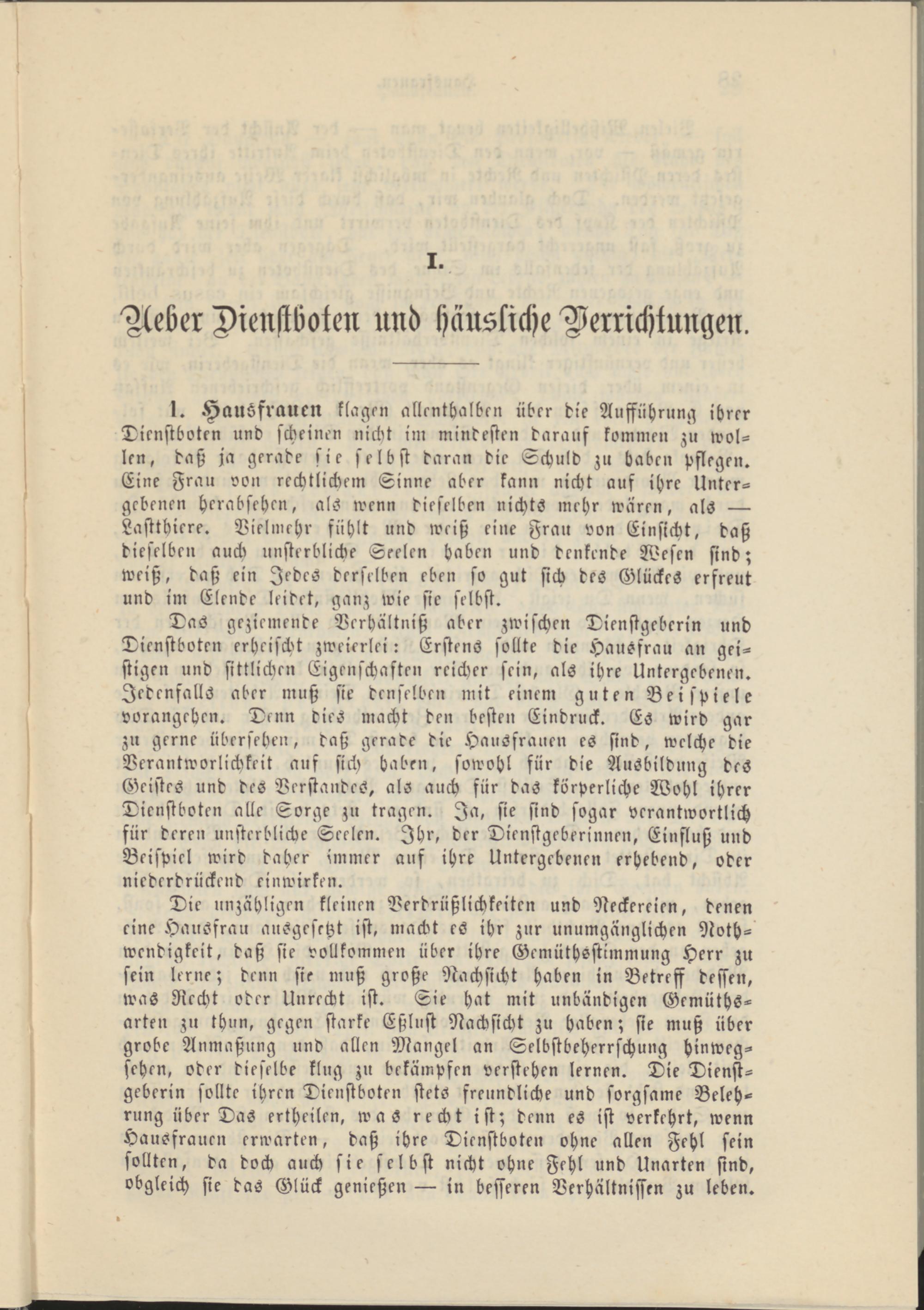 I. Hausfrauen klugen allenthalben über die Aufführung ihrer Dienstboten und scheinen nicht im mindesten darauf kommen zu wollen, daß ja gerade sie selbst daran die Schuld zu haben pflegen. Eine Frau von rechtlichem Sinne aber kann nicht auf ihre Untergebenen herabsehen, als wenn dieselben nichts mehr wären, als — Lastthiere. Vielmehr fühlt und weiß eine Frau von Einsicht, daß dieselben auch unsterbliche Seelen haben und denkende Wesen sind; weiß, daß ein Jedes derselben eben so gut sich des Glückes erfreut und im Elende leidet, ganz wie sie selbst.