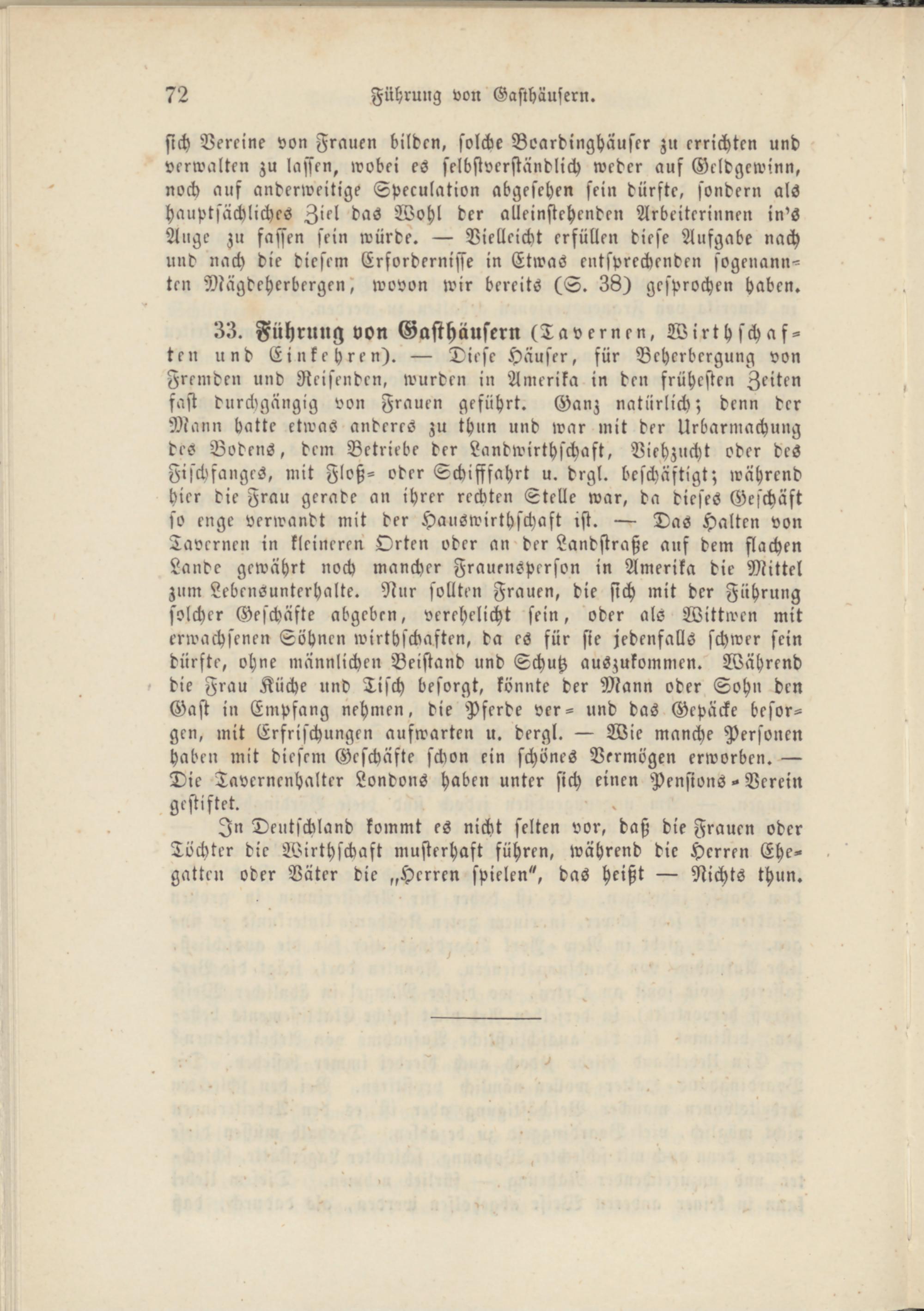 33. Führung von Gasthäusern (Tavernen, Wirthschaften und Einkehren). — Diese Häuser, für Beherbergung von Fremden und Reisenden, wurden in Amerika in den frühesten Zeiten fast durchgängig von Frauen geführt. Ganz natürlich; denn der Mann hatte etwas anderes zu thun und war mit der Urbarmachung des Bodens, dem Betriebe der Landwirthschast, Viehzucht oder des Fischfanges, mit Floß- oder Schifffahrt u. drgl. beschäftigt; während hier die Frau gerade an ihrer rechten Stelle war, da dieses Geschäft so enge verwandt mit der Hauswirthschaft ist. — Das Halten von Tavernen in kleineren Orten oder an der Landstraße auf dem stachen Lande gewährt noch mancher Frauensperson in Amerika die Mittel zum Lebensunterhalte. Nur sollten Frauen, die sich mit der Führung solcher Geschäfte abgeben, verehelicht sein, oder als Wittwen mit erwachsenen Söhnen wirthschaften, da es für sie jedenfalls schwer sein dürfte, ohne männlichen Beistand und Schutz auszukommen. Während , die Frau Küche und Tisch besorgt, könnte der Mann oder Sohn den Gast in Empfang nehmen, die Pferde ver- und das Gepäcke besorgen, mit Erfrischungen aufwarten u. dergl. — Wie manche Personen haben mit diesem Geschäfte schon ein schönes Vermögen erworben. — Die Tavcrncnhalter Londons haben unter sich einen Pensions - Verein gestiftet.