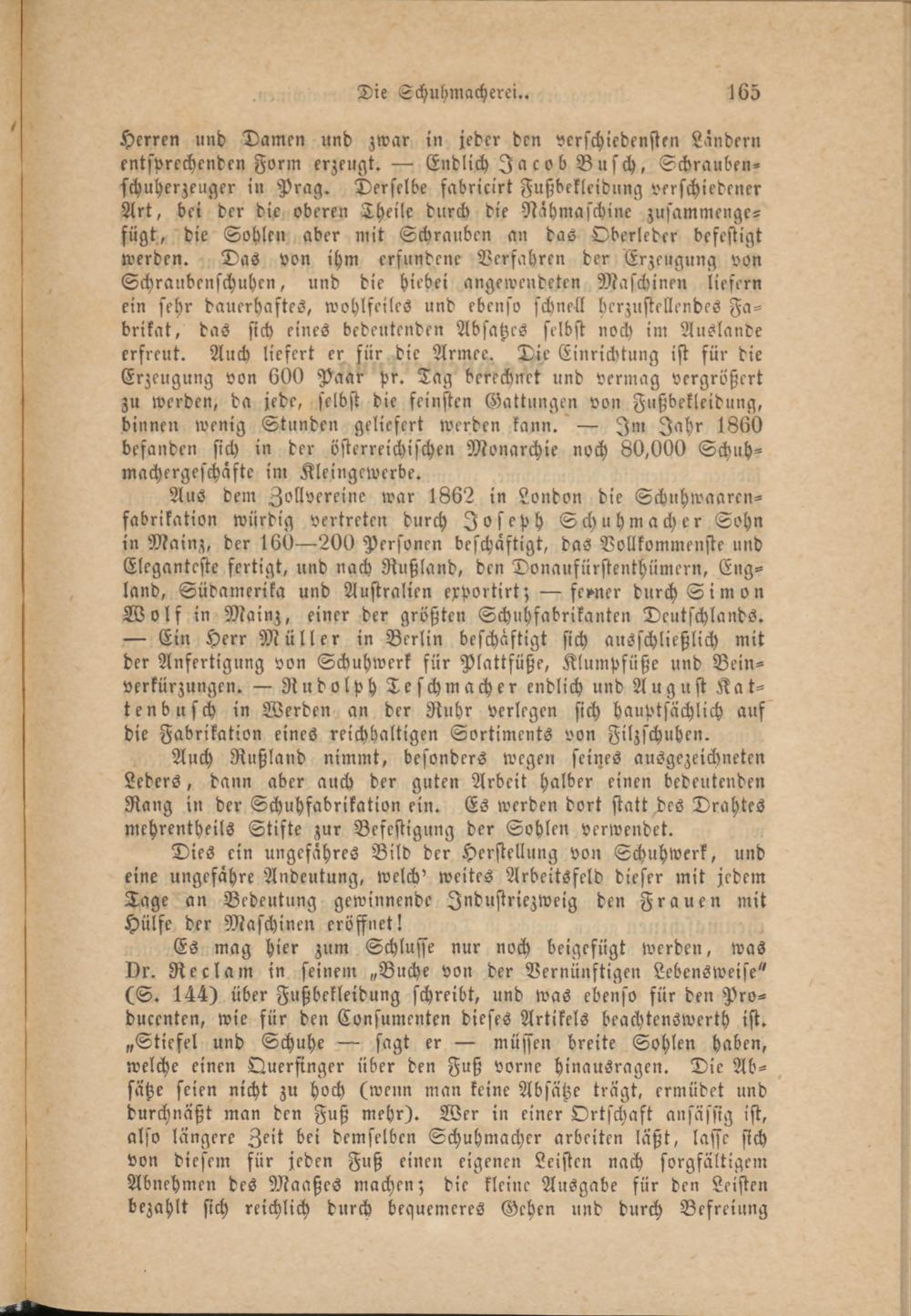Herren und Damen und zwar in jeder den verschiedensten Ländern entsprechenden Form erzeugt. — Endlich Jacob Busch, Schrauben- schuherzeuger in Prag. Derselbe fabricirt Fußbekleidung verschiedener Art, bei der die oberen Theile durch die Nähmaschine zusammengefügt, die Sohlen aber mit Schrauben an das Oberleder befestigt werden. Das von ihm erfundene Verfahren der Erzeugung von Schraubenschuhen, und die Hiebei angewendeten Maschinen liefern ein sehr dauerhaftes, wohlfeiles und ebenso schnell herzustellendes Fabrikat, das sich eines bedeutenden Absatzes selbst noch im Auslande erfreut. Auch liefert er für die Armee. Die Einrichtung ist für die Erzeugung von 600 Paar pr. Tag berechnet und vermag vergrößert zu werden, da jede, selbst die feinsten Gattungen von Fußbekleidung, binnen wenig Stunden geliefert werden kann. — Im Jahr 1860 befanden sich in der österreichischen Monarchie noch 80,000 Schuh- machergeschäftc im Kleingewerbe.