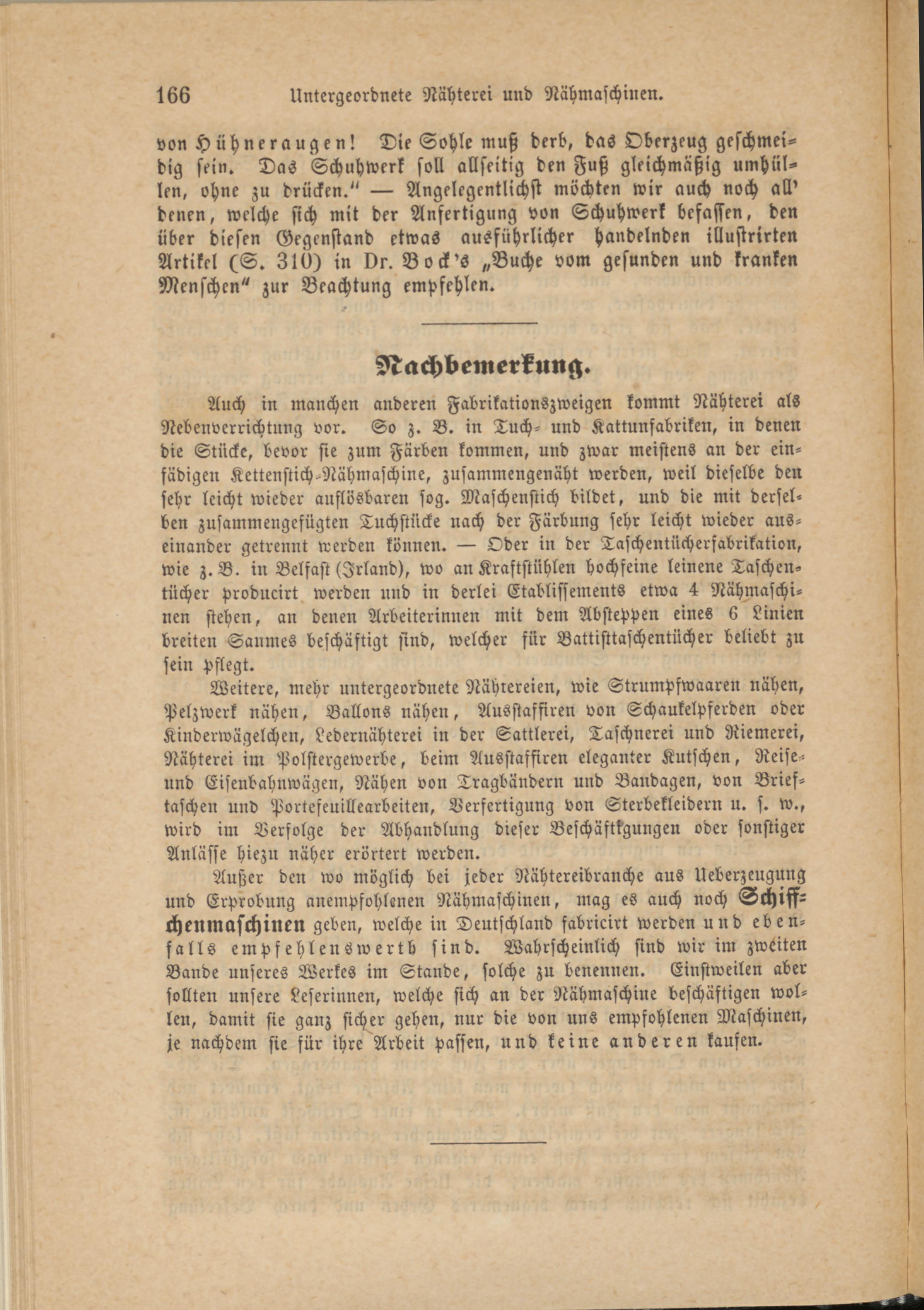 Außer den wo möglich bei jeder Nähtereibranche aus Ueberzeugung und Erprobung anempfohlenen Nähmaschinen, mag es auch noch Skhifs- chenmaschinen geben, welche in Deutschland fabricirt werden und ebenfalls empfehlens wertb sind. Wahrscheinlich sind wir im zweiten Bande unseres Werkes im Stande, solche zu benennen. Einstweilen aber sollten unsere Leserinnen, welche sich an der Nähmaschine beschäftigen wollen, damit sie ganz sicher gehen, nur die von uns empfohlenen Maschinen, je nachdem sie für ihre Arbeit Passen, und keine anderen kaufen.