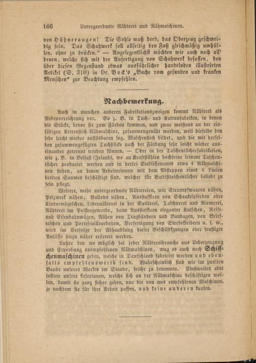 Auch in manchen anderen Fabrikationszweigen kommt Nähterei als Nebenverrichtung vor. So z. B. in Tuch- und Kattunfabriken, in denen die Stücke, bevor sie zum Färben kommen, und zwar meistens an der ein- fädigen Kettenstich-Nähmaschine, zusammengenäht werden, weil dieselbe den sehr leicht wieder auflösbaren sog. Maschenstich bildet, und die mit derselben zusammengefügten Tuchstücke nach der Färbung sehr leicht wieder auseinander getrennt werden können. — Oder in der Taschentücherfabrikation, wie z.B. in Belfast (Irland), wo an Kraftstühlen hochfeine leinene Taschentücher producirt werden und in derlei Etablissements etwa 4 Nähmaschinen stehen, an denen Arbeiterinnen mit dem Absteppen eines 6 Linien breiten Saumes beschäftigt sind, welcher für Battisttaschentücher beliebt zu sein Pflegt.