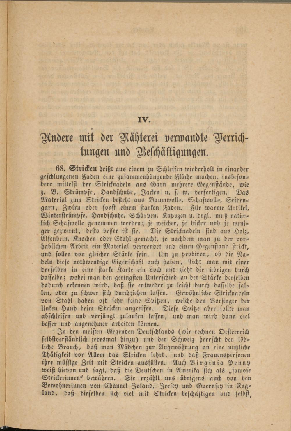 68. Stricken heißt aus einem zu Schleifen wiederholt in einander geschlungenen Faden eine zusammenhangende Fläche machen, insbesondere mittelst der Stricknadeln aus Garn mehrere Gegenstände, wie z. B. Strümpfe, Handschuhe, Jacken u. s. w. verfertigen. Das Material zum Stricken besteht aus Baumwoll-, Schafwoll-, Seiden- garn, Zwirn oder sonst einem starken Faden. Für warme Artikel, Winterstrttmpfe, Handschuhe, Schärpen, Kapuzen u. drgl. muß natürlich Schafwolle genommen werden; je weicher, je dicker und je weniger gezwirnt, desto besser ist sie. Die Stricknadeln sind aus Holz, Elfenbein, Knochen oder Stahl gemacht, je nachdem man zu der vor- hablichen Arbeit ein Material verwendet und einen Gegenstand strickt, und sollen von gleicher Stärke sein. Um zu probiren, ob die Nadeln diese nothwendige Eigenschaft auch haben, sticht man mit einer derselben in eine starke Karte ein Loch und zieht die übrigen durch dasselbe; wobei man den geringsten Unterschied an der Stärke derselben dadurch erkennen wird, daß sie entweder zu leicht durch dasselbe fallen, oder zu schwer sich durchziehen lassen. Gewöhnliche Stricknadeln von Stahl haben oft sehr feine Spitzen, welche den Vorfinger der linken Hand beim Stricken angreifen. Diese Spitze aber sollte man abschleifen und verjüngt zulaufen lassen, und man wird dann viel besser und angenehmer arbeiten können.