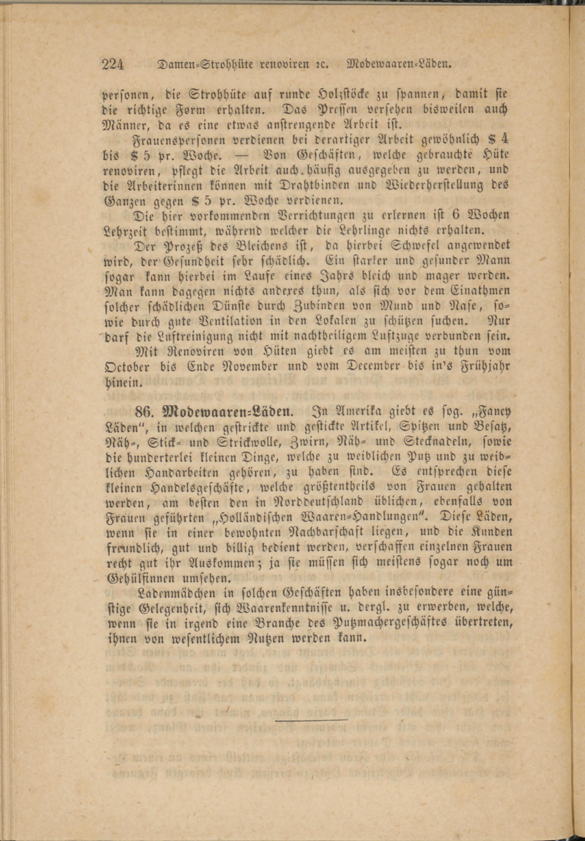 86. Modewaaren-Läden. In Amerika giebt es sog.Fancy Laden", in welchen gestrickte und gestickte Artikel, Spitzen und Besatz, Näh-, Stick- und Strickwolle, Zwirn, Näh- und Stecknadeln, sowie die hunderterlei kleinen Dinge, welche zu weiblichen Putz und zu weib­lichen Handarbeiten gehören, zu haben sind. Es entsprechen diese kleinen Handelsgeschäfte, welche größtentheils von Frauen gehalten werden, am besten den in Norddeutschland üblichen, ebenfalls von Frauen geführtenHolländischen Waaren-Handlungen". Diese Läden, wenn sie in einer bewohnten Nachbarschaft liegen, und die Kunden freundlich, gut und billig bedient werden, verschaffen einzelnen Frauen recht gut ihr Auskommen; ja sie müssen sich meistens sogar noch um Gehülfinnen umsehen.