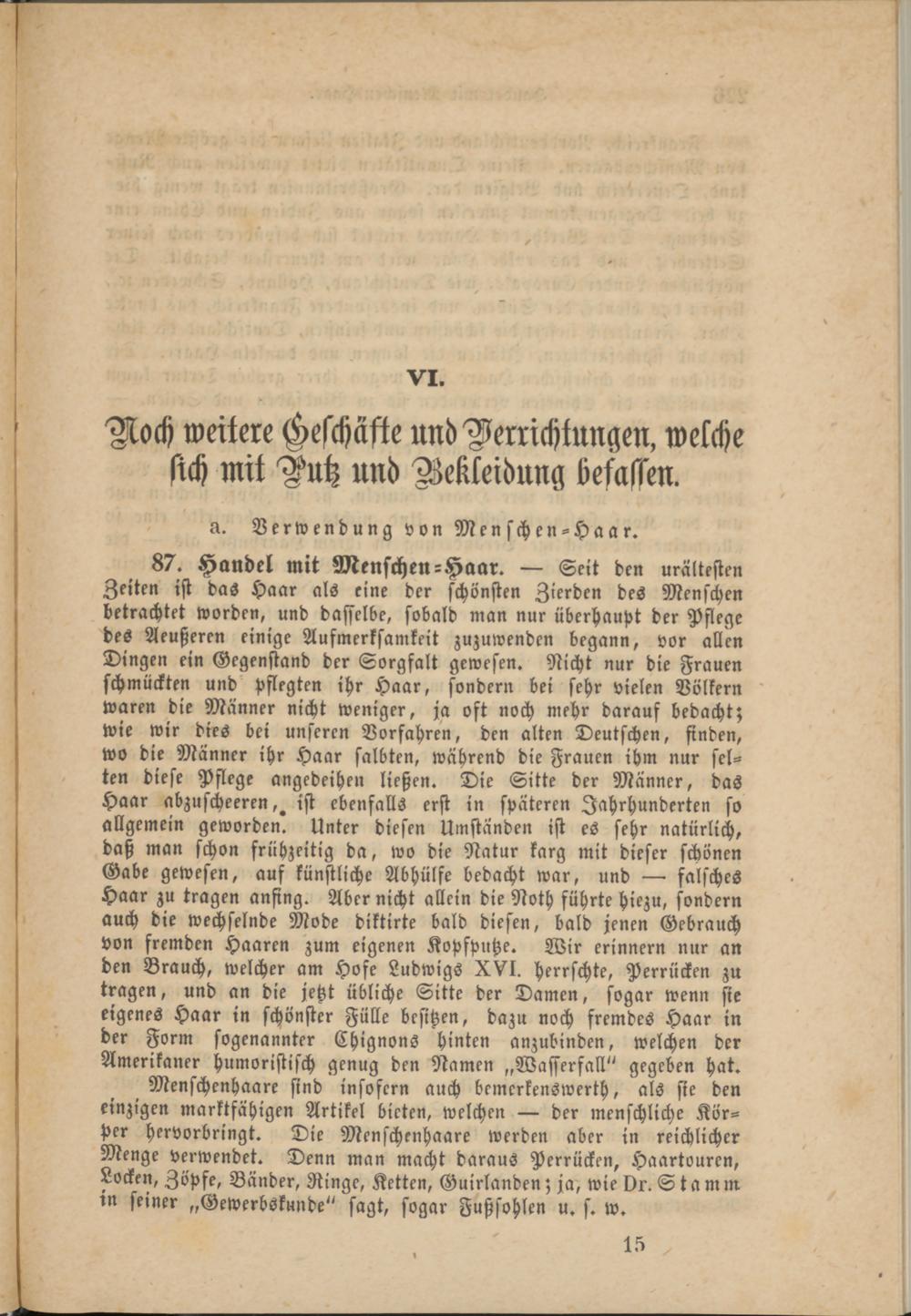 Menschenhaare sind insofern auch bemerkenswerth, als sie den einzigen marktfähigen Artikel bieten, welchen — der menschliche Körper hervorbringt. Die Menschenhaare werden aber in reichlicher Menge verwendet. Denn man macht daraus Perrücken, Haartouren, Locken, Zöpfe, Bänder, Ringe, Ketten, Guirlanden; ja, wie Dr. Stamm in seiner „Gewerbskunde" sagt, sogar Fußsohlen u. s. w.