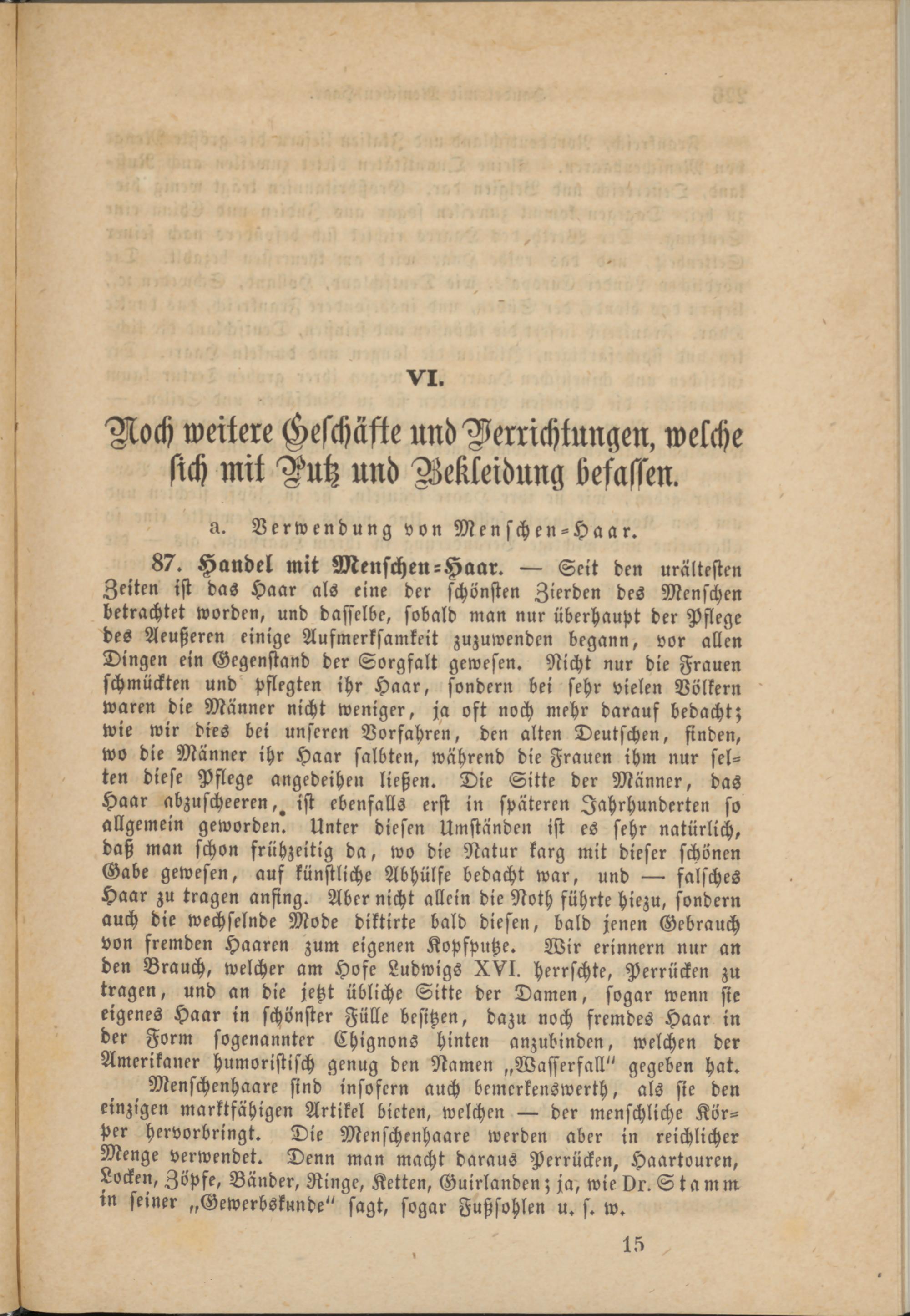 87. Handel mit Menschen-Haar. — Seit den urältesten Zeiten ist das Haar als eine der schönsten Zierden des Menschen betrachtet worden, und dasselbe, sobald man nur überhaupt der Pflege des Aeußeren einige Aufmerksamkeit zuzuwenden begann, vor allen Dingen ein Gegenstand der Sorgfalt gewesen. Nicht nur die Frauen schmückten und' pflegten ihr Haar, sondern bei sehr vielen Völkern waren die Männer nicht weniger, ja oft noch mehr darauf bedacht; wie wir dies bei unseren Vorfahren, den alten Deutschen, finden, wo die Männer ihr Haar salbten, während die Frauen ihm nur selten diese Pflege angedeiheu ließen. Die Sitte der Männer, das Haar abzuscheeren,, ist ebenfalls erst in späteren Jahrhunderten so allgemein geworden. Unter diesen Umständen ist es sehr natürlich, daß man schon frühzeitig da, wo die Natur karg mit dieser schönen Gabe gewesen, auf künstliche Abhülfe bedacht war, und — falsches Haar zu tragen anfing. Aber nicht allein die Noth führte hiezu, sondern auch die wechselnde Mode diktirte bald diesen, bald jenen Gebrauch von fremden Haaren zum eigenen Kopfputze. Wir erinnern nur an den Brauch, welcher am Hofe Ludwigs XVI. herrschte, Perrücken zu tragen, und an die jetzt übliche Sitte der Damen, sogar wenn sie eigenes Haar in schönster Fülle besitzen, dazu noch fremdes Haar in der Form sogenannter Chignons hinten anzubinden, welchen der Amerikaner humoristisch genug den Namen „Wasserfall" gegeben hat.