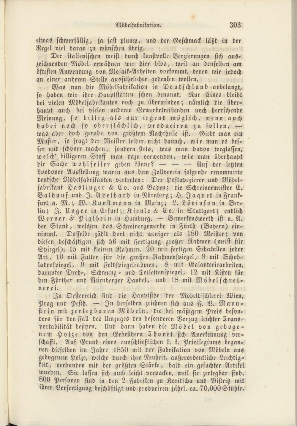 In Oesterreich sind die Hanptsitze der Möbeltischlerei Wien, Prag und Pesth. — In derselben zeichnen sich aus F. V. Mann- stein mit zerlegbaren Möbeln, die bei mäßigem Preis besonders für den Fall des Umzuges den besonderen Vorzug leichter Trans- Portabilität besitzen. Und dann haben die Möbel von gebogenem Holze von den Gebrüdern Thonet sich Anerkennung verschafft. Auf Grund eines ausschließlichen k. k. Privilegiums begannen dieselben im Jahre l850 mit der Fabrikation von Möbeln aus gebogenem Holze, welche durch ihre Neuheit, außerordentliche Leichtigkeit, verbunden mit der größten Stärke, bald ein gesuchter Artikel wurden. Sie lassen sich auch leicht verpacken, weil sie zerlegbar sind. 800 Personen sind in den 2 Fabriken zu Koritscha und Bistritz mit ihrer Verfertigung beschäftigt und produciren jährl. ca. 70,000 Stühle.