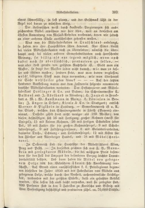 Was nun die Möbelfabrikation in Deutschland anbelangt, so haben wir ihre Hauptstätten schon benannt. Nur Eines bleibt bei vielen Möbelfabrikanten noch zu überwinden; nämlich die überhaupt auch bei vielen anderen Gewerbetreibenden noch herrschende Meinung, so billig als nur irgend möglich, wenn auch dabei noch so oberflächlich, produciren zu sollen, — was aber doch gerade von größtem Nachtheile ist. Giebt man ein Muster, so fragt der Meister leider nicht danach, wie man es besser und schöner machen, sondern stets, was man davon weglassen, welch' billigeren Stoff man dazu verwenden, wie man überhaupt die Sache wohlfeiler geben könne? — — — Auf der letzten Londoner Ausstellung waren aus dem Zollverein folgende renommirte deutsche Möbelfabrikanten vertreten: Der Hoftapezierer und Möbelfabrikant Haslinger L Co. aus Baden; die Schreinermeister E. Baldauf und I. Adelhard in Nürnberg; H. Iaquet in Frankfurt a. M.; W. Kunstmann in Mainz; L. Lövinson in Berlin; I. Unger in Erfurt; Kienle L C o. in Stuttgart; endlich Werner L Piglhein in Hamburg. — Bemerkenswerth ist u. A. der Stand, welchen das Schreiner-gewerbe in Fürth (Bayern) einnimmt. Dasselbe zählt dort nicht weniger als 180 Meister; von diesen beschäftigen sich 56 mit Fertigung großer Nahmen (meist für Spiegel), 15 mit kleinen Rahmen, 20 mit fertigen Schatullen jeder Art, 10 mit Futter für die großen Rahmenspiegel, 9 mit Schub- ladenspiegel, 9 mit Feldspiegelrahmen, 8 mit Galanteriearbeiten, darunter Dreh-, Schwung- und Toilettenspiegel, 12 mit Kisten für den Fürther und Nürnberger Handel, und 18 mit Möbel schreineren