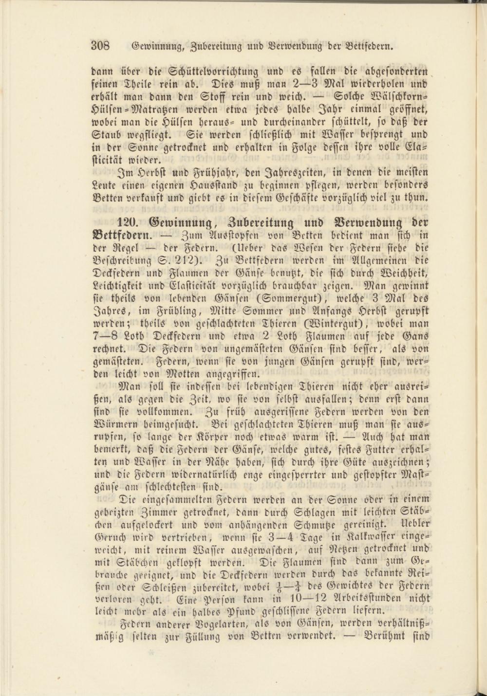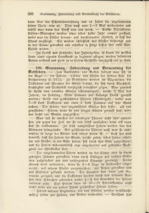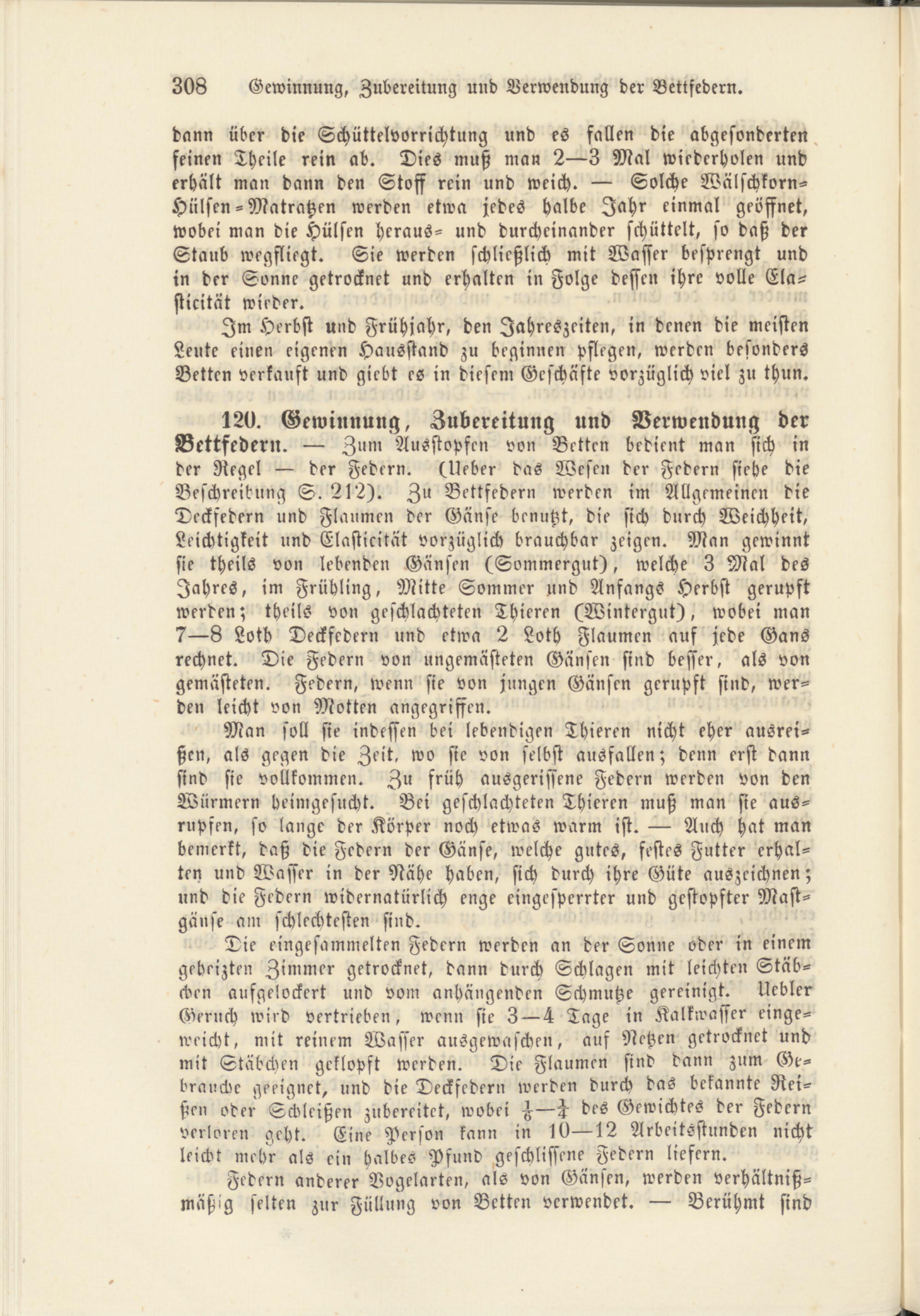 120. Gewinnung, Zubereitung und Verwendung der Bettfedern. — Zum Ausstopfen von Betten bedient man sich in der Regel — der Federn. (Ueber das Wesen der Federn siehe die Beschreibung S. 2l2). Zu Bettfedern werden im Allgemeinen die Decksedern und Flaumen der Gänse benutzt, die sich durch Weichheit, Leichtigkeit und Elasticität vorzüglich brauchbar zeigen. Man gewinnt sie theils von lebenden Gänsen (Sommergut), welche 3 Mal des Jahres, im Frühling, Mitte Sommer und Anfangs Herbst gerupft werden; theils von geschlachteten Thieren (Wintergut), wobei man 7—8 Loth Deckfedern und etwa 2 Loth Flaumen auf jede Gans rechnet. Die Federn von ungemästeten Gänsen sind besser, als von gemästeten. Federn, wenn sie von jungen Gänsen gerupft sind, werden leicht von Motten angegriffen.