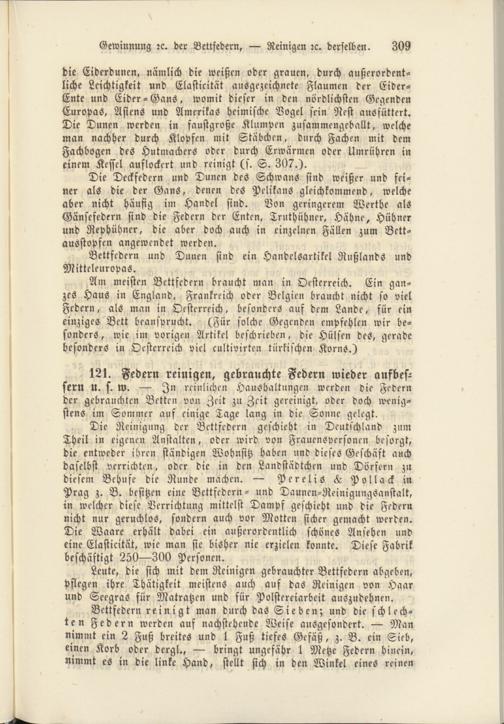 121. Federn reinigen, gebrauchte Federn wieder aufbessern U. s. W. — In reinlichen Haushaltungen werden die Federn der gebrauchten Betten von Zeit zu Zeit gereinigt, oder doch wenigstens im Sommer auf einige Tage lang in die Sonne gelegt.