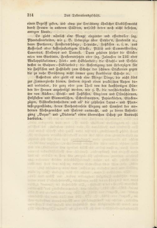 Außerdem aber giebt es noch eine Menge Dinge, die nicht blos zur Zimmcrzierde dienen, sondern irgend einen praktischen Nutzen damit verbinden, die ganz oder zum Theil von den kunstfertigen Händen der Frauen angefertigt werden, wie z. B. die verschiedensten Arten von Rücken-, Stuhl- und Fußkissen, Etageren und Ofenschirmen, Holzkasten und Blumentischen, Schreibmappen, Papierkörben, Glocken- zügen, Visitenkartenhaltern und all' die zahllosen Luxus- und Phantasiegegenstände, deren Vorhandensein Eleganz und Comfort der modernen Wohngemächer und Salons ausmacht, und zu deren Anfertigung „Bazar" und „Victoria" einen überreichen Schatz zur Auswahl darbieten.